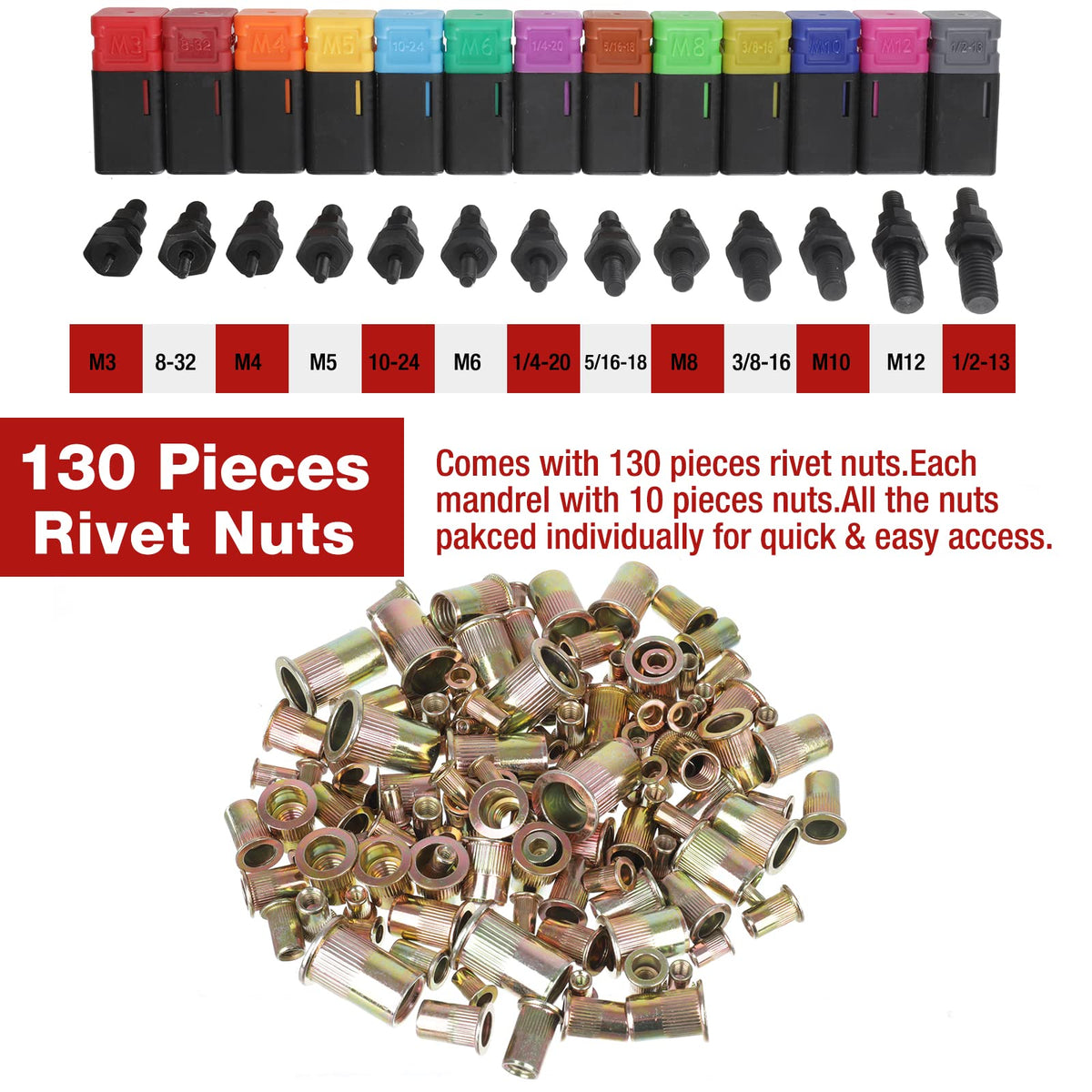 Package Includes: 1 × 16 inch Rivet Nut Tool 13 × Mandrels 130 × Rivet Nuts 1 × Multifunctional Spanner 1 × Toolbox 1 × User Manual Please note the M8 mandrel was installed in the gun,so the small box of M8 is empty.