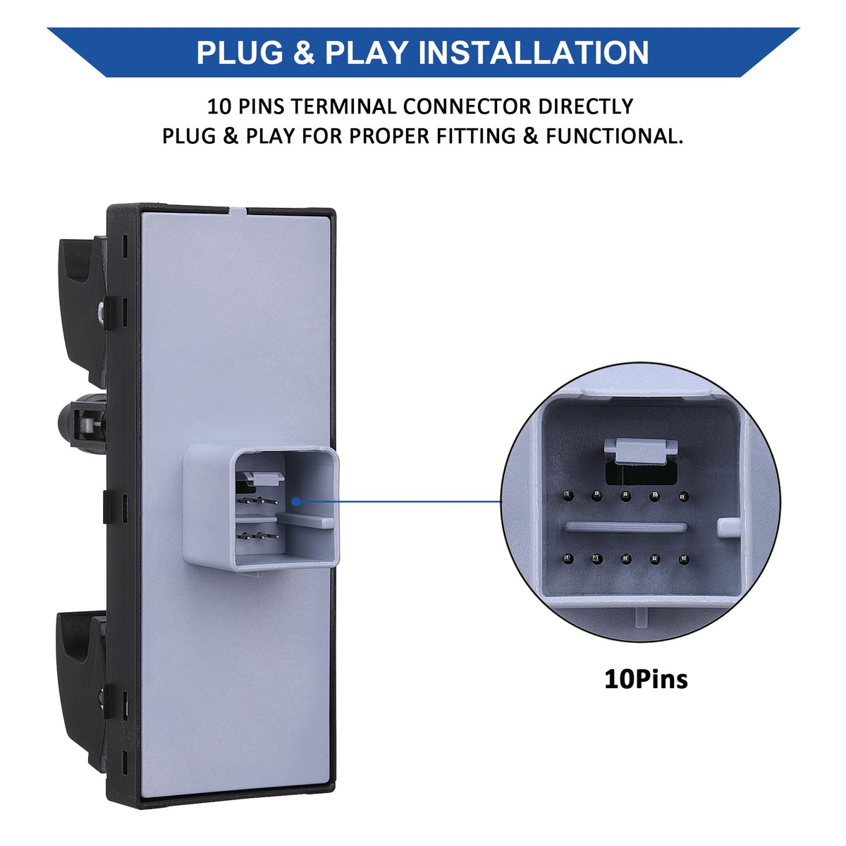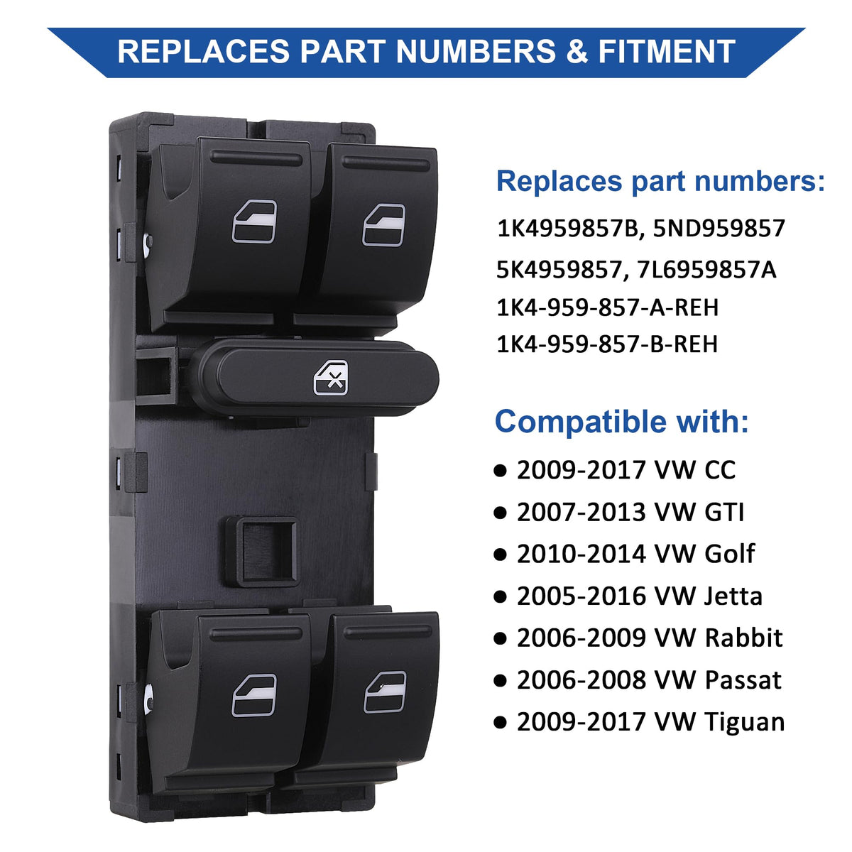 AiYiGu Power Window Switch is brand new and durable replacement for your defective window switch at best price. All of the models listed replacement window switches have been 100% factory tested in compatibility. ?Compatibility?: ?Compatible with VW Passat 2006 2007 2008 ?Compatible with VW Rabbit 2006 2007 2008 2009 ?Compatible with VW Golf 2010 2011 2012 2013 2014 ?Compatible with VW GTI 2007 2008 2009 2010 2011 2012 2013 ?Compatible with VW Tiguan 2009 2010 2012 2013 2014 2015 2016 2017 ?Compatible with VW CC 2009 2010 2011 2012 2013 2014 2015 2016 2017 ?Compatible with VW Jetta 2005 2006 2007 2008 2009 2010 2011 2012 2013 2014 2015 2016 ?Features?: ?Buttons: 5 buttons ?Backlight Color: Red ?Terminal: 10 Pins ?Directly plug and play style ?Material: PP plastic & ABS plastic ?Replaces Original (OE) Part Numbers#: 1K4959857B 5ND959857 5K4959857 ?Package Include?: 1 x Power Window Switch & 1 x Switch Removal Tool ?Purchase Without Worry?: If the power window switch has any problems, simply contact us for giving you a satisfactory solution.