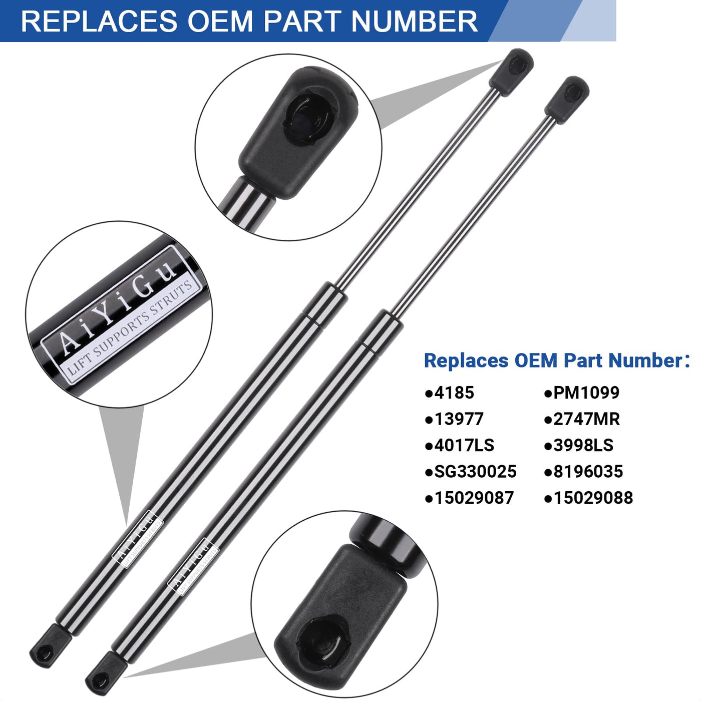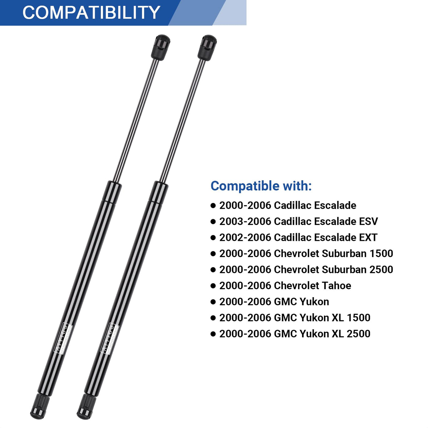 AiYiGu branded rear hood gas spring manufactured to be identical in appearance and operation to your model lifter. No any program required, easy install, no get stiff when it working.?Compatibility?? Compatible with 4-Door Cadillac Escalade following series:2000-2006 Escalade Base2003-2006 Escalade ESV1999-2006 Escalade EXT? Compatible with 4-Door Chevy Suburban following series:2000-2006 Suburban 1500 Base/LS/LT/Z712000-2006 Suburban 2500 Base/LS/LT/Z71? Compatible with Chevy Tahoe following series:2000-2006 Tahoe Base 2-Door/4-Door2000-2006 Tahoe LS 2-Door? Compatible with GMC Yukon following series:2000-2006 Yukon SL 2-Door2000-2006 Yukon Base 2-Door2001-2006 Yukon Base 4-Door2000-2005 Yukon SLE 2-Door2005-2006 Yukon SLE 4-Door2000-2006 Yukon SLT 2-Door1999-2006 Yukon SLT 4-Door2000-2006 Yukon XL 1500 2-Door1999-2006 Yukon XL 1500 4-Door2000-2006 Yukon XL 2500 2-Door1999-2006 Yukon XL 2500 4-Door1999-2006 Yukon Denali SLE 4-Door 1999-2006 Yukon Denali SLT 4-Door 2000-2006 Yukon Denali Base 2-Door 2000-2006 Yukon Denali Base 4-Door 2001-2006 Yukon Denali XL Base 2-Door ?Before installation??Don 't attempting to compress the struts before installing.?Please use a flathead screwdriver for easy installation.?Before installing hood struts, prop up your front heavy hood by a rod or helper to stay away from harm.?After installation??There might a little stiff when hood struts first runing. You just need cycle the hood up and down for a couple of few times, it will smothly as OEM.