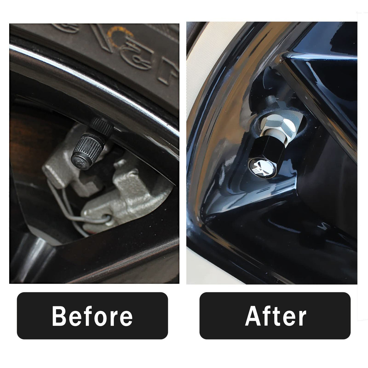Q: Can these valve caps be used as a gift?A: Absolutely! The unique skull design not only enhances your car's exterior but also makes for a thoughtful gift for friends and family who appreciate distinctive car accessories.