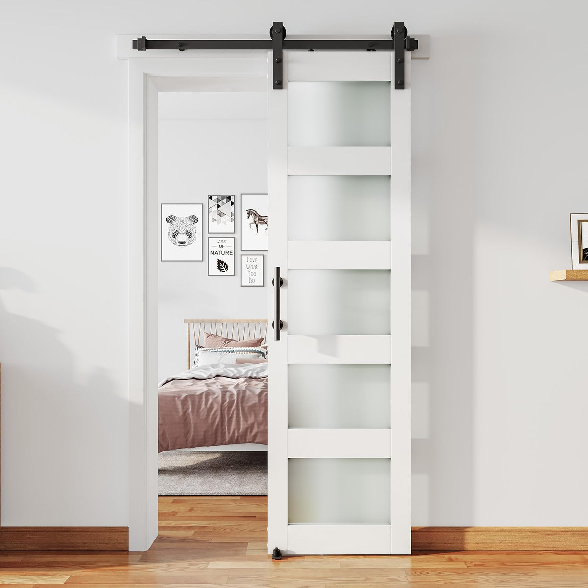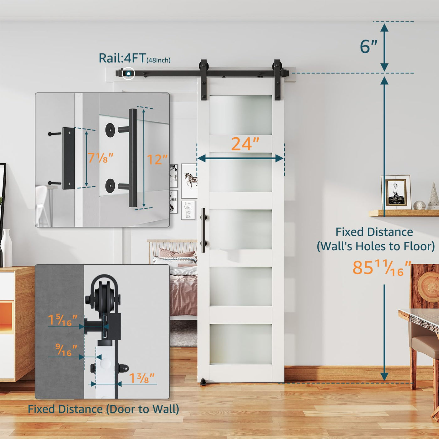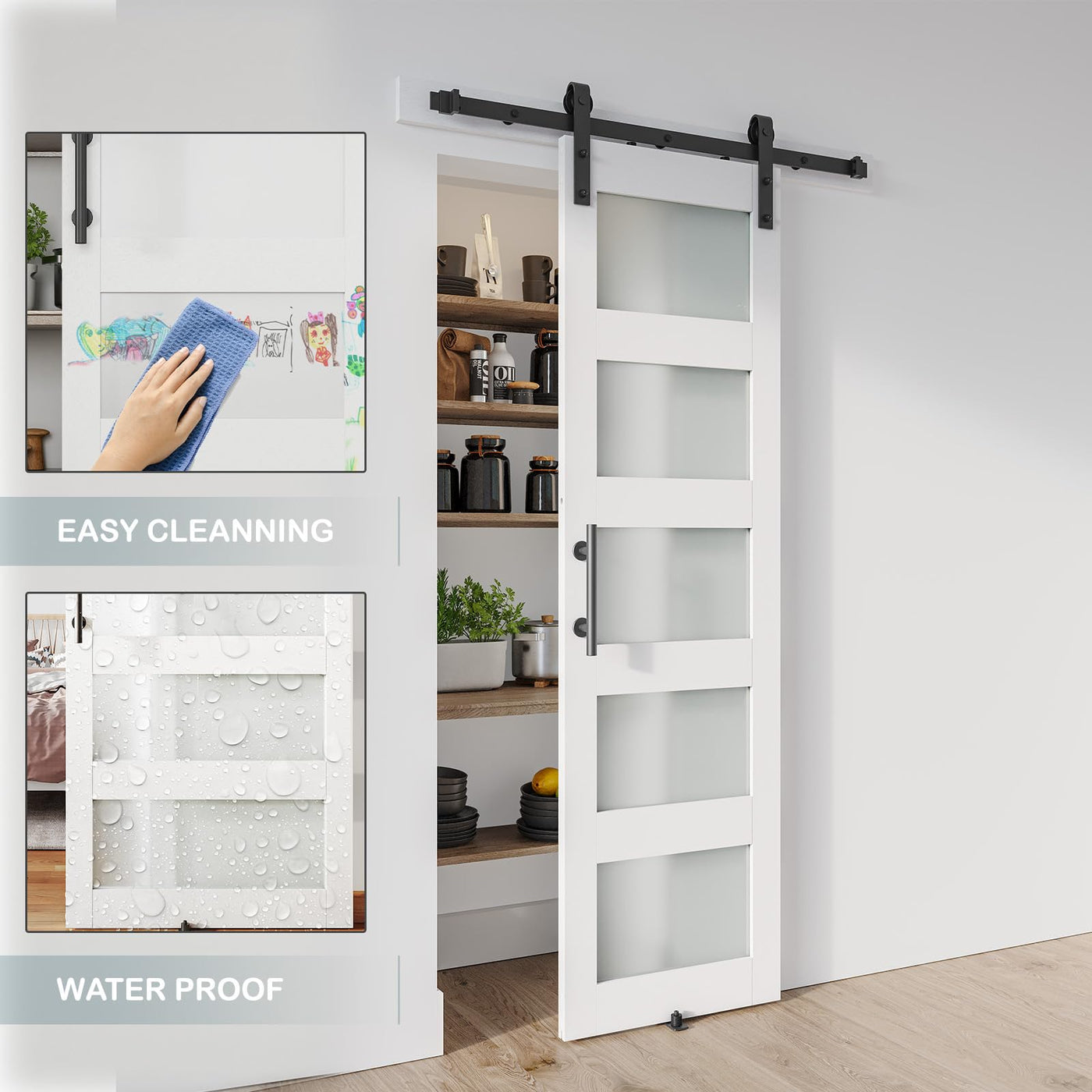 MDF Material: With CARB P2 certification, the main component is pine wood and a small amount of other wood and adhesives are added to extrude the wood slab. High-quality furniture decoration materials, harder than a natural wood door. | Easy Installation for DIY Novice: Pre-drilled Door and hardware, with step by step installation manual, professional customer service, any question would be replied within 24 hours. Easy and Meaningful Installation processes with your family. Nice product gift for your home decor! | Package Includes: 1x Barn Door, Width: 24'' Height: 84'' Thickness: 1 3/8''; 1 X 4 FT Barn door hardware kit, 1x Barn Door Handle, length: 12''; 1x Barn Door Floor Guide, as the picture shows. (The door is not assembled) | PVC-Surface: The high-quality white PVC material is tightly bonded to the MDF wood board through high temperature and high pressure, and the layers are laminated to create a tightly bonded, waterproof, and scratch-resistant surface. The opaque glass design protects the privacy of customers and greatly increases the light transmittance. Make the whole room bright and modern. | Multiple Application: a sliding door for your house, match with dining room, living room, bathroom, kitchen, storage! Save home space, harmless and easy cleaning.