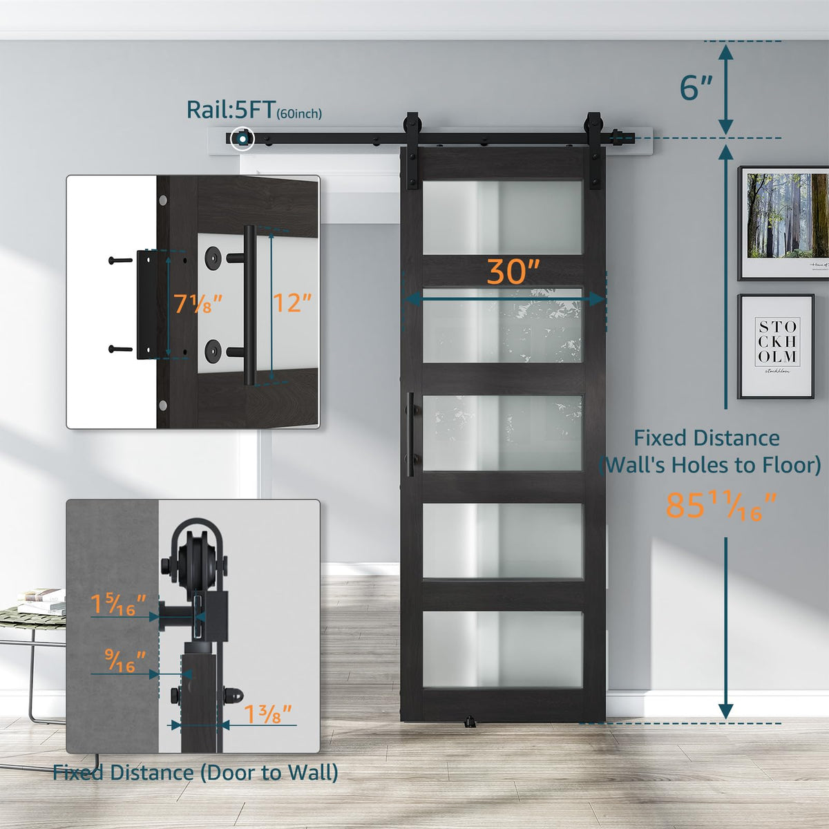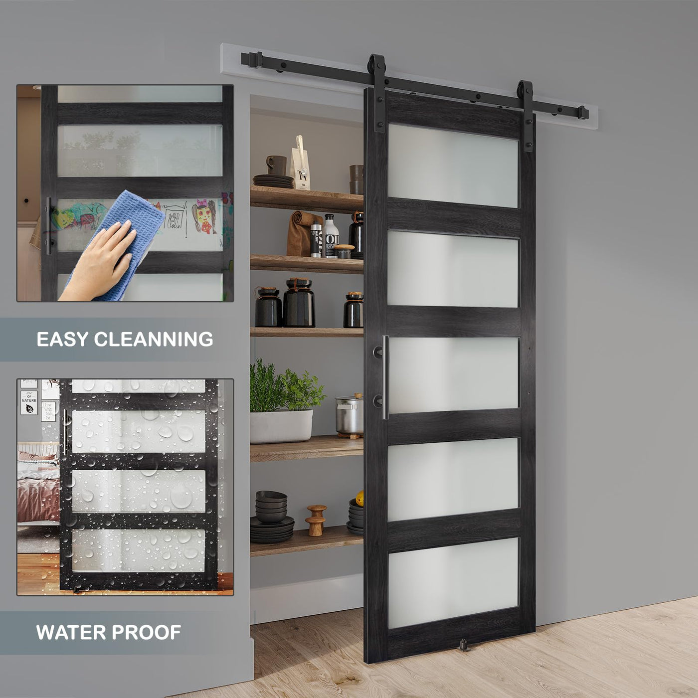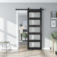 Alamedadt 30'' X 84'' Glass Barn Door And 5 Ft Hardware Kit Included, Mdf White Barn Door Slab With Frosted Glass, Pvc Surface, Combined With Handle And Floor Guide-Assembly Required, Dark Grey