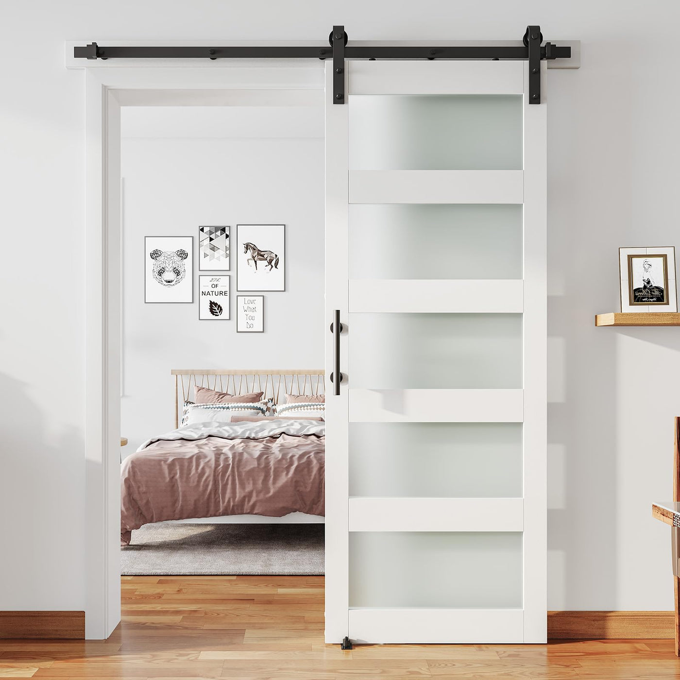 30'' x 96'' Glass Barn Door and 5 Ft Hardware Kit Included, MDF White Barn Door Slab with Frosted Glass, PVC Surface, Combined with Handle and Floor Guide-Assembly Required, White