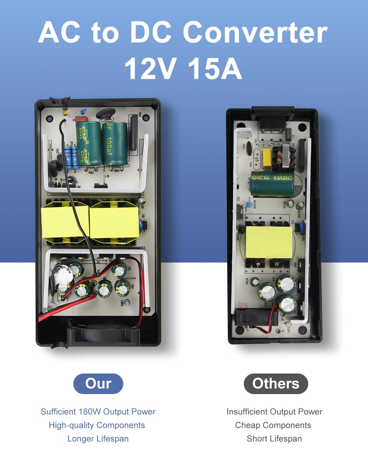 Parameter Input Voltage: 100~240V AC Output: 12V DC 15A 180W max Adapter body size: Please refer to the picture Power cord length: about 11.5ft Safety Compliance: CCC/ FCC / CE Working Temperature: 0~40 Degrees Celsius Storage Temperature: -20~60 Degrees Celsius Ambient Humidity: 0~95% Non-Condensation Package: 1x AC 100~240V to DC 12V 15A 180W Converter with cigarette lighter socket
