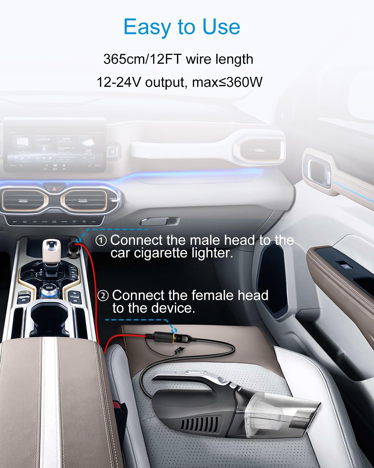 Q: How long is the ALITOVE extension cord?A: The ALITOVE extension cord measures 12 feet (3.65 meters) in length, allowing you to easily extend your power source from the car to reach the furthest wheels or other devices.