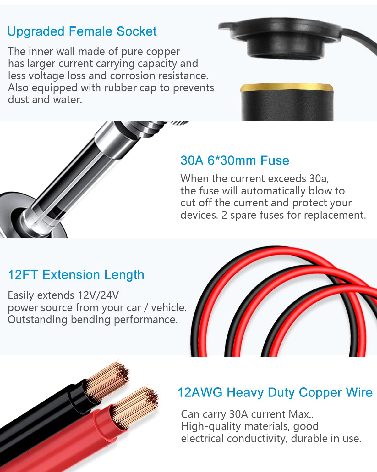 Alitove 12Awg Cigarette Lighter Extension Cord 12Ft 30A 360W Max. Heavy Duty Power Cable Male Plug To Female Socket For 12V 24V