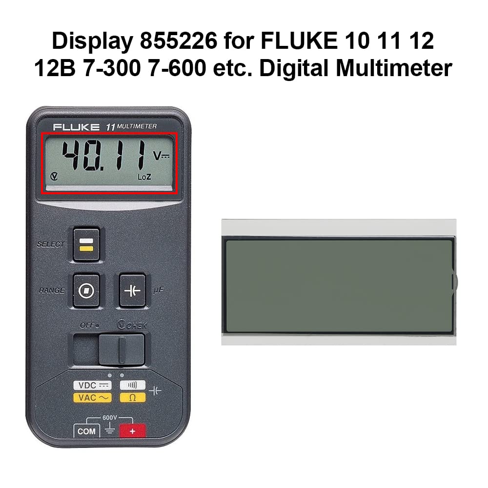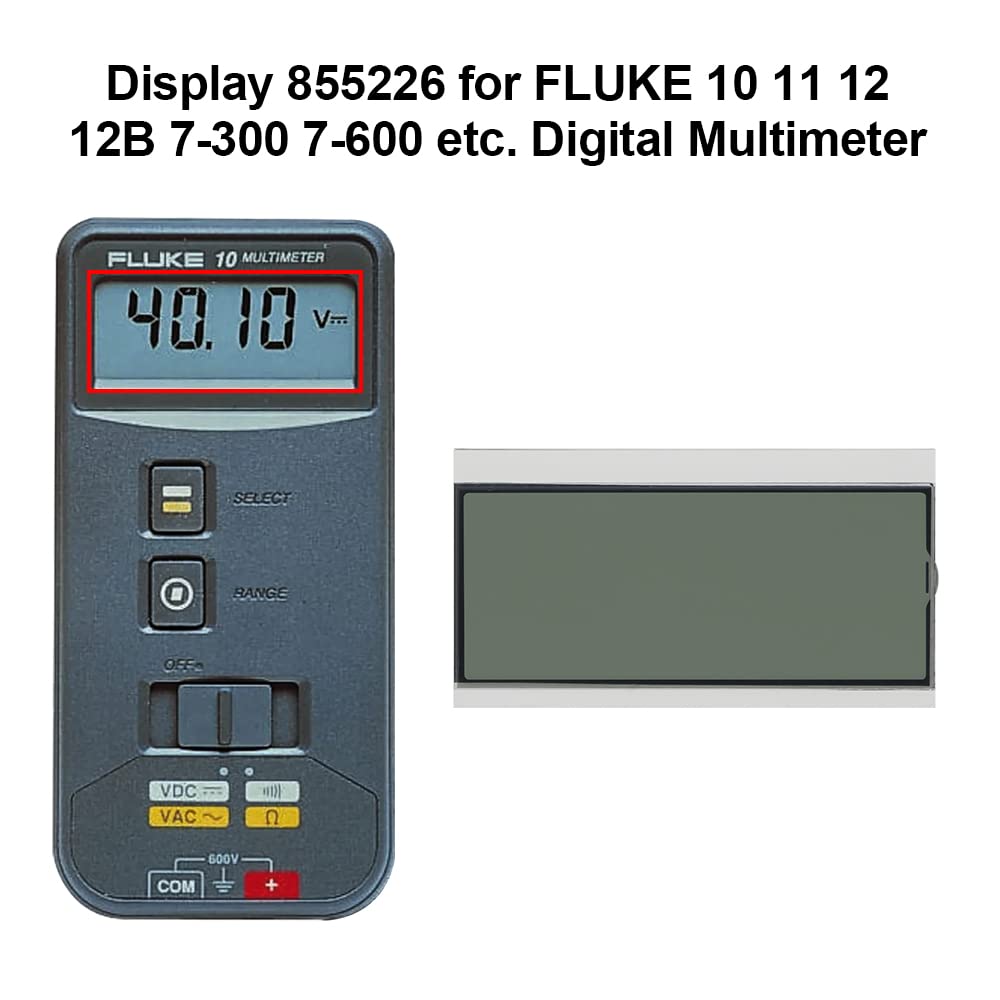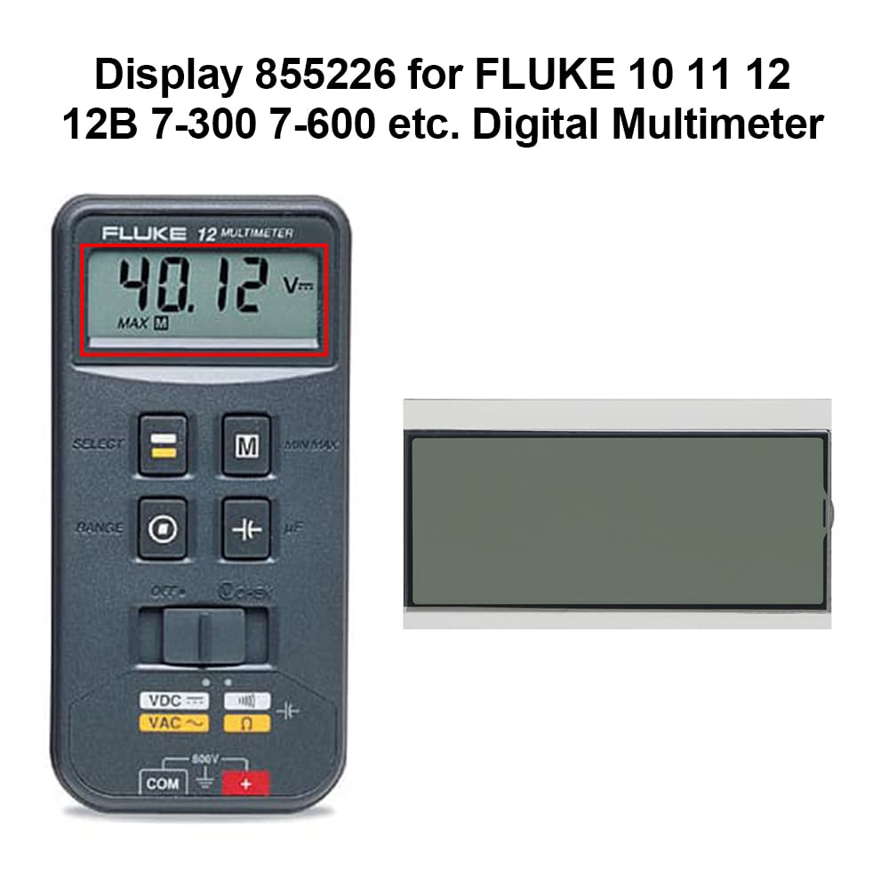Display 855226 Replacement for FLUKE 10 11 12 12B 7300 7600 etc. Digital Multimeter Replacement for FLUKE 10 11 12 12B 7300 7600 etc. Digital Multimeter Screen Reference OEM Numbers: 855226, SLF7723G Screen Size: 55.5*30mm Package Included: 1PCS LCD Display. We selling LCD display only, the digital multimeter in picture as an application scenario instruction, not included for .