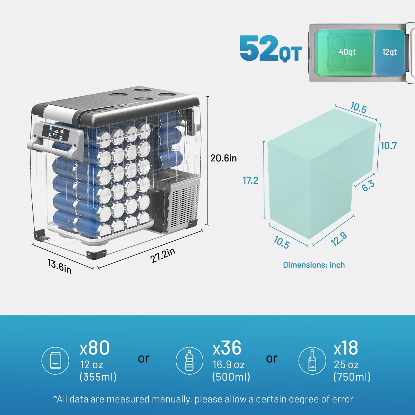 Product Details Exterior Dimensions:27.2 X 13.6 X20.6 Inches Capacity:58 Quart(55 Liter) Voltage: 12V/24V(Dc) Rated Power: 45W Temperature Control Range:-4?~68?(-20?~+20?) Noise:=45Db Weight:35Lbs
