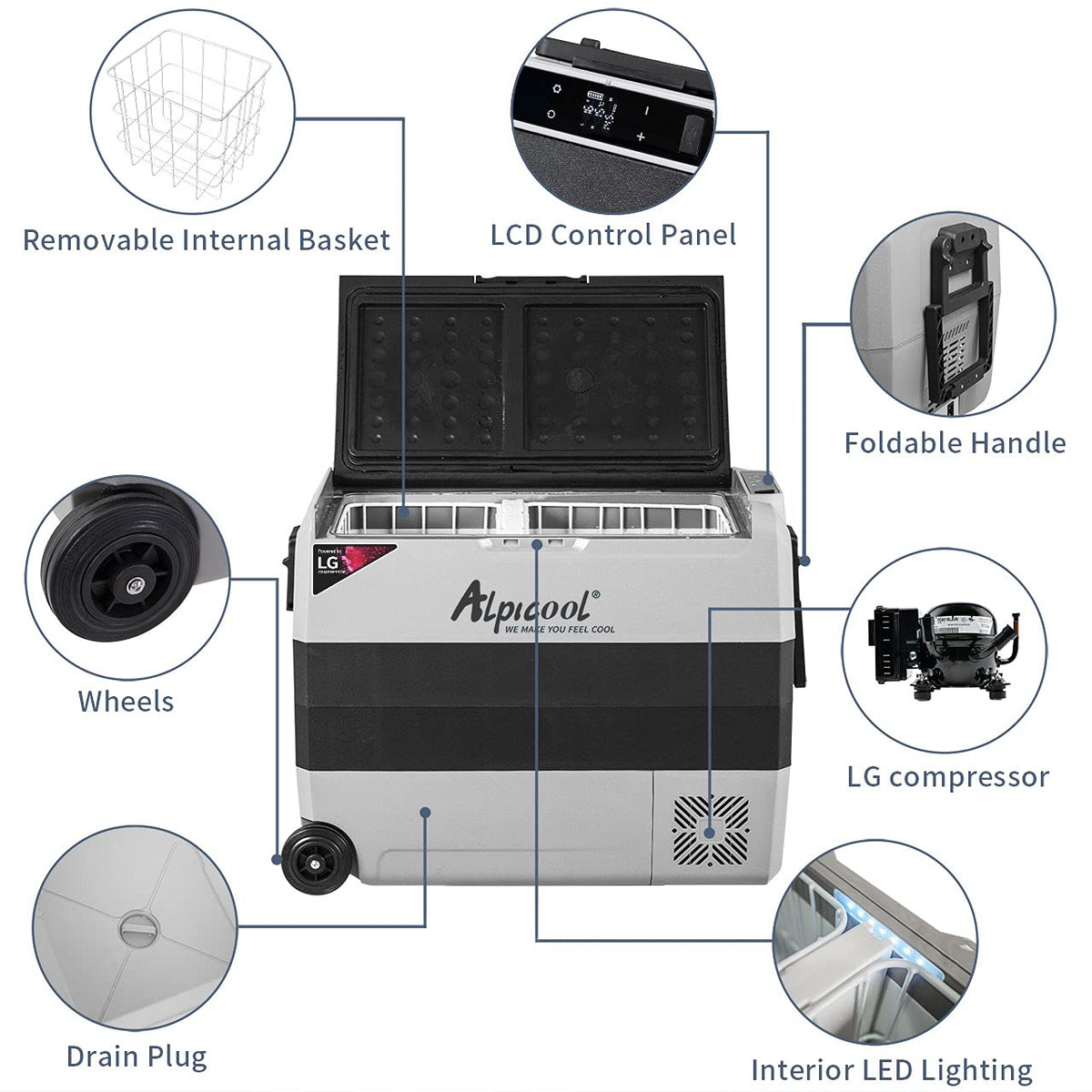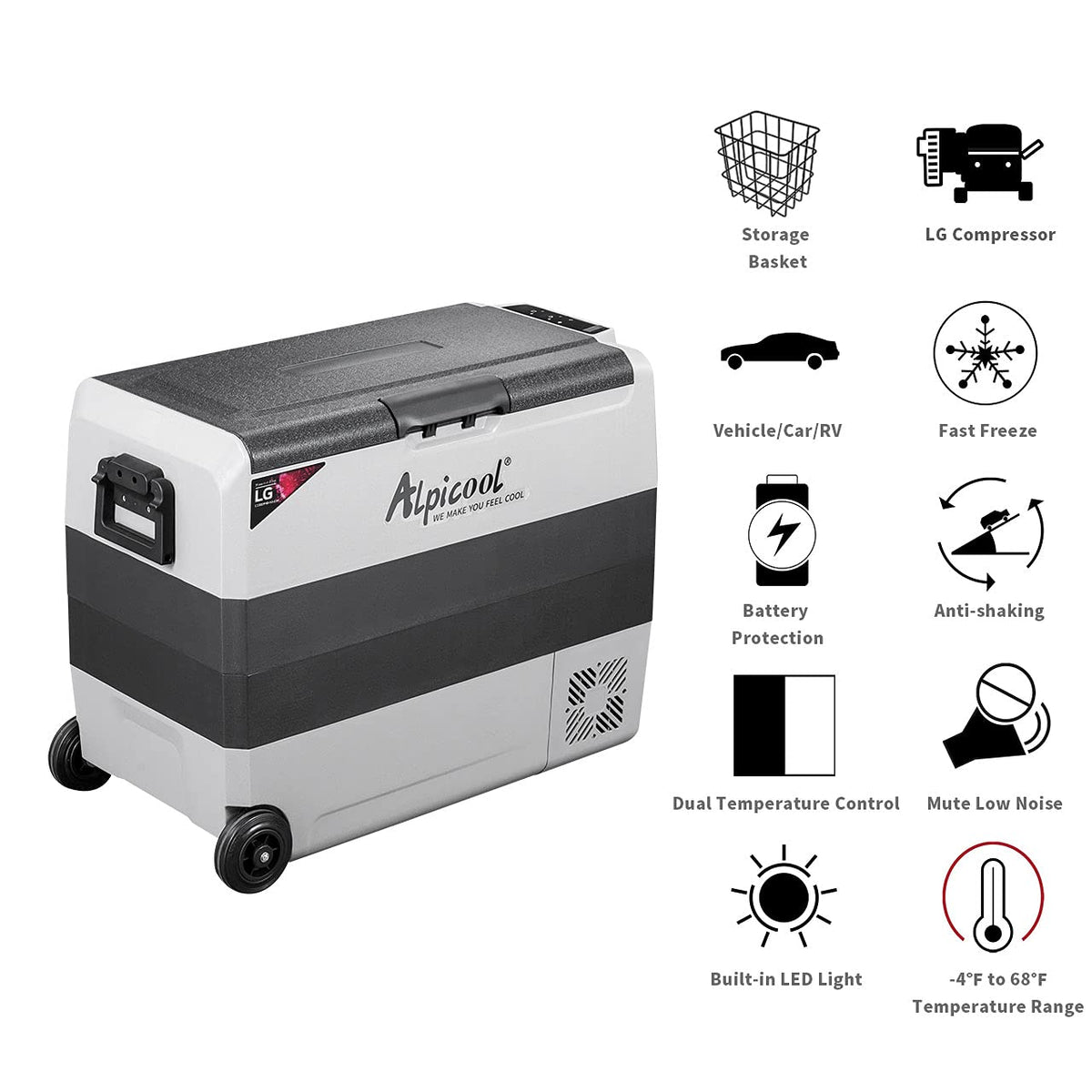 Key Features of Alpicool T60-LG - LCD display panel ,built-in LED light and internal basket. - Detachable sensor divider and Two temperature control system - With foldable handles and wheels, easy for moving. - Suitable for Car and home using work on 12/24V DC and 110-240V AC. - 3 stage car battery protection system to prevent the car battery run off. - Vibration resistant design to protect the device safety while driving on road. - Digital control panel with electronic temperature control.-LG compressor,makes effficient cooling performance,ECO and HH modes can be chose as need. Product Details Exterior Dimensions:28.5 x 14.2x21.6 inches Capacity:63 Quart(60 Liter) Voltage: 12V/24V(DC Rated power: 45W Temperature Control Range:-4?~50?(-20?~+10?) Noise:=45dB Net Weight:37.5Lbs Package 1 X Alpicool T60-LG refrigerator 1 X DC power cord(12/24V)1 X AC adapter(110-240V) 1 X Instruction book The T60-LG Portable Fridge is a new Alpicool model with latest two temperature control system function. It is a great portable refrigerator to meet a variety of refrigeration needs. Whether you're off to the park for a picnic, or on the road camping for months, the New Alpicool T60-LG Portable Fridges with best portable design for outdoor travel for your whole day , they are invaluable for keeping your food fresh and your drinks cold with two temperature zone! The Alpicool T60-LG is capable of being powered from 12V and 24V car battery.Ready for hitting the high-way ,have a wonderful time on your adventure? No doubt Alpicool LGT60 refrigerator is your best choice!