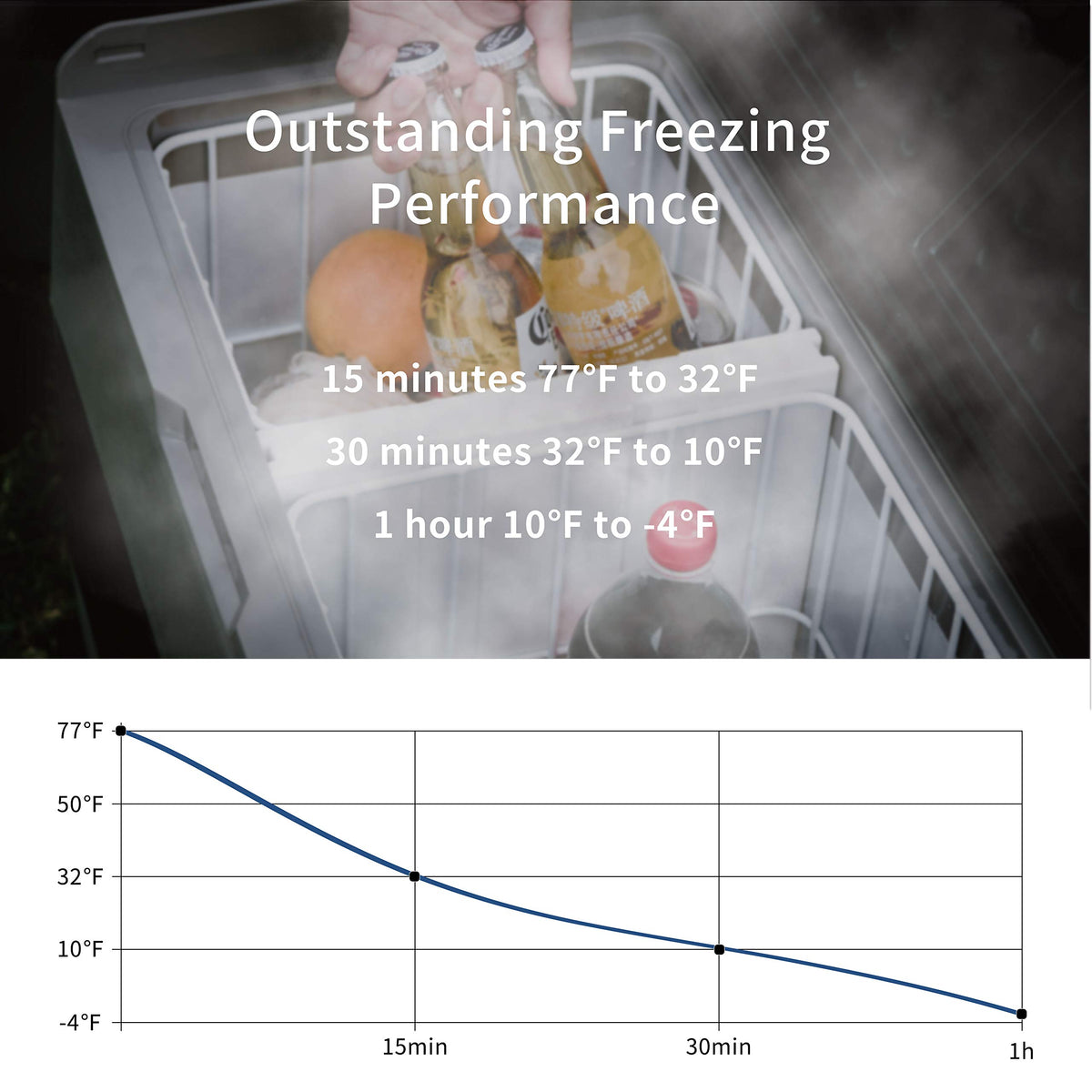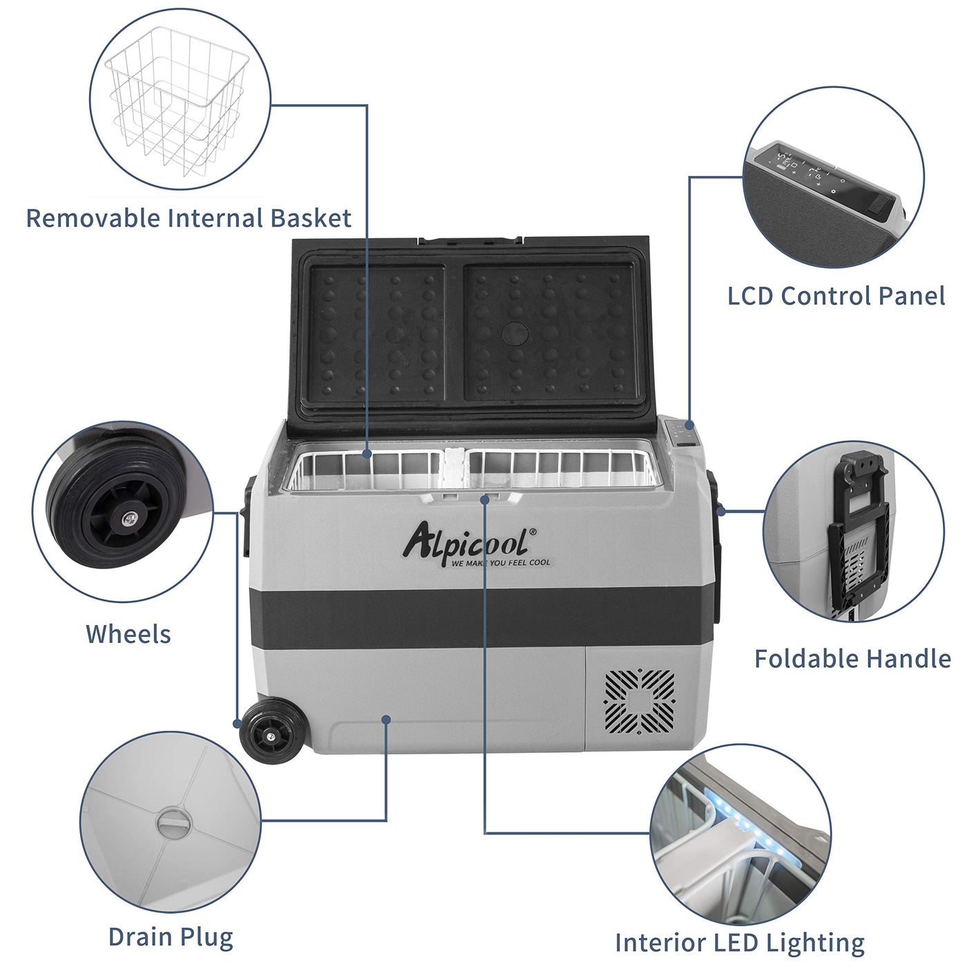Key Features of Alpicool T50 - LCD display panel ,built-in LED light and internal basket. - Detachable sensor divider and Two temperature control system - With foldable handles and wheels, easy for moving. -Suitable for Car, RV, Truck in 12/24V DC ,run great with your solar system. - 3 stage car battery protection system to prevent the car battery run off. - Vibration resistant design to protect the device safety while driving on road. - Digital control panel with electronic temperature control. - High efficiency compressor with adjustable ECO and HH modes. Product Details Exterior Dimensions:28.5 x 14.2x18 inches Capacity:53 Quart(50 Liter) Voltage: 12V/24V(DC) Rated power: 45W Temperature Control Range:-4?~50?(-20?~+10?) Noise:=45dB Net Weight:34.2Lbs Package 1 X Alpicool T50 refrigerator 1 X DC power cord(12/24V)1 X AC adapter(110-240V) 1 X Instruction book The T50 Portable Fridge is a new Alpicool model with latest two temperature control system function. It is a great portable refrigerator to meet a variety of refrigeration needs. Whether you're off to the park for a picnic, or on the road camping for months, the New Alpicool T50 Portable Fridges with best portable design for outdoor travel for your whole day , they are invaluable for keeping your food fresh and your drinks cold with two temperature zone! The Alpicool T50 is capable of being powered from 12V and 24V car battery. Ready for hitting the high-way ,have a wonderful time on your adventure? No doubt Alpicool T50 refrigerator is your best choice!