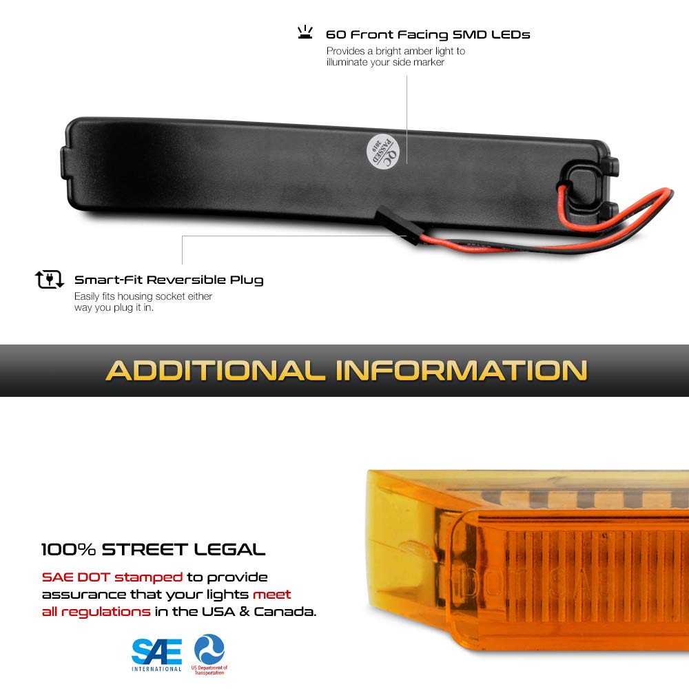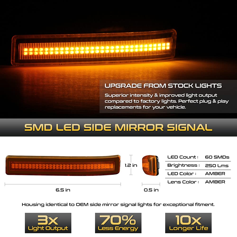 Q: How bright is the LED compared to OEM light bulbs?A: The Amber LED Strip is designed to be 3X brighter than OEM light bulbs. It features built-in high power SMD LED chips that maximize illumination on the side mirror, providing enhanced visibility.