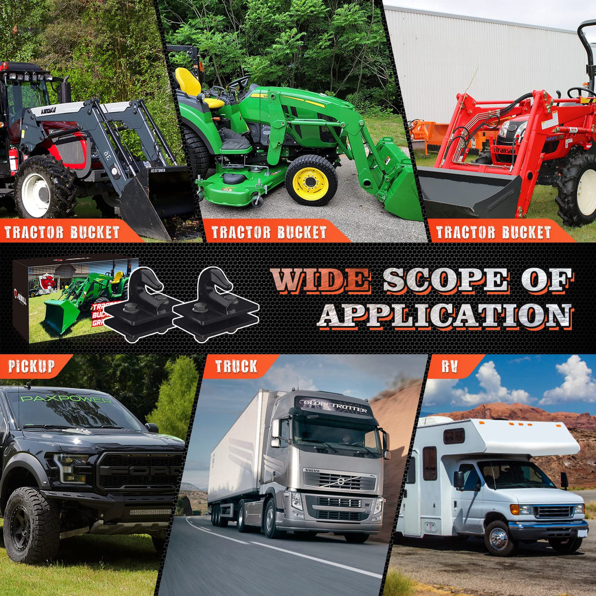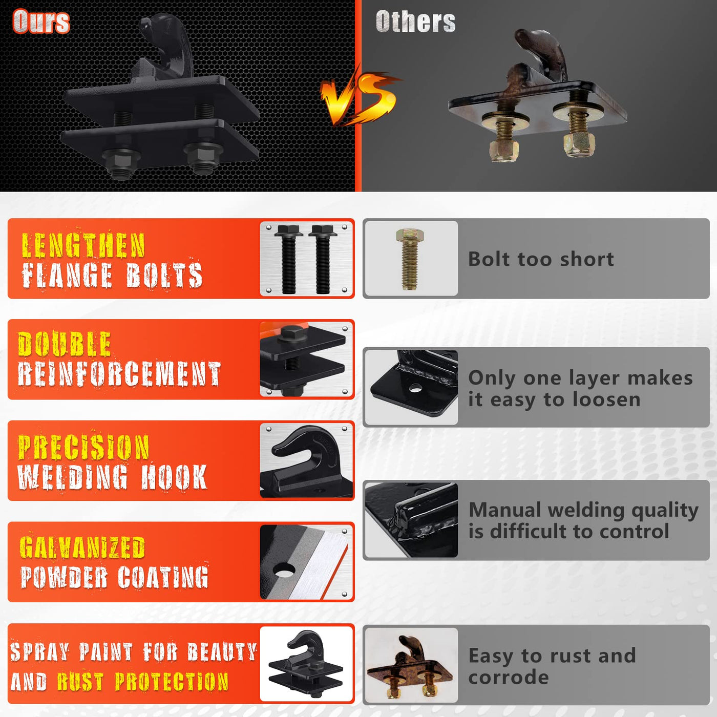 Specifications: * Condition: 100% Brand New * Package Includes: 2 X Grab Hooks With Backer Plate * Hook Size: As the picture shows * Working Load Limit : 7500 lbs * Breaking Load Limit: 15000 lbs * Color: Red/ Black/ Blue/ Orange/ Green/ Grey * Material: Heavy Duty Forged Steel Features: 1. 3/8 Grab Hook Bolt-On Mount with Backer Plate for Installation 2. Grab Hook is Grade 70 rated at 7,500 lbs. WLL (Working Load Limit),Breaking Load Limit: 15,000 lbs. 3. Grab Hook is Welded On a 1/4'' Thick Steel Plate. 4. The Grab Hook is Made With Heavy Duty Drop Forged Steel, Which is Galvanized and Power Coated, Solid Inside, Ensures the Durability And Also Prevents Rust and Corrosion. 5. Every Mount Includes 1/2'' x 1-1/2'' Grade 10.9 Bolts and Outer Nut.
