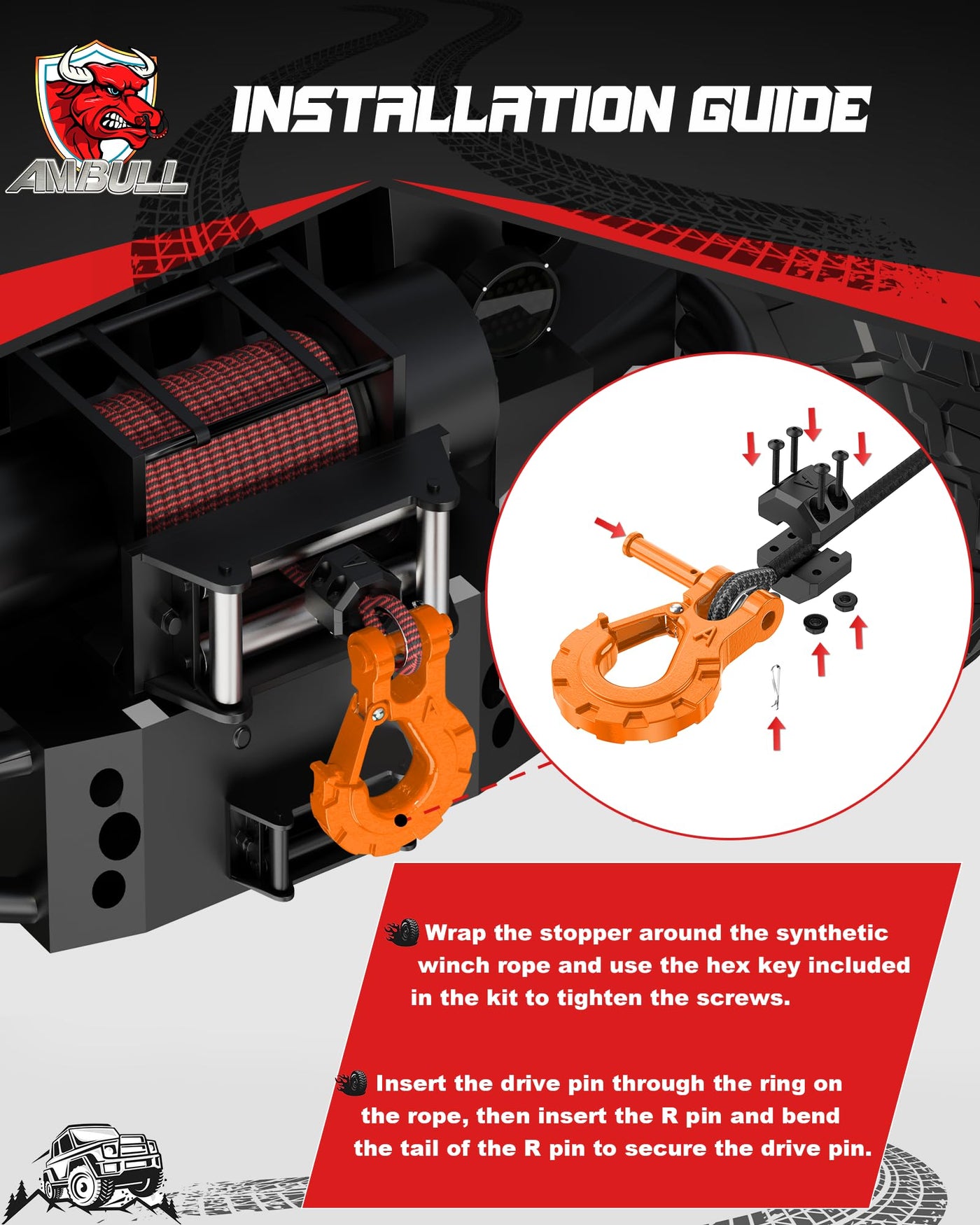 Q: Can the AMBULL winch hook stopper be easily installed?A: Yes, the winch cable hook stopper has a split design for easy installation and comes with a portable Allen wrench, making it convenient for users.