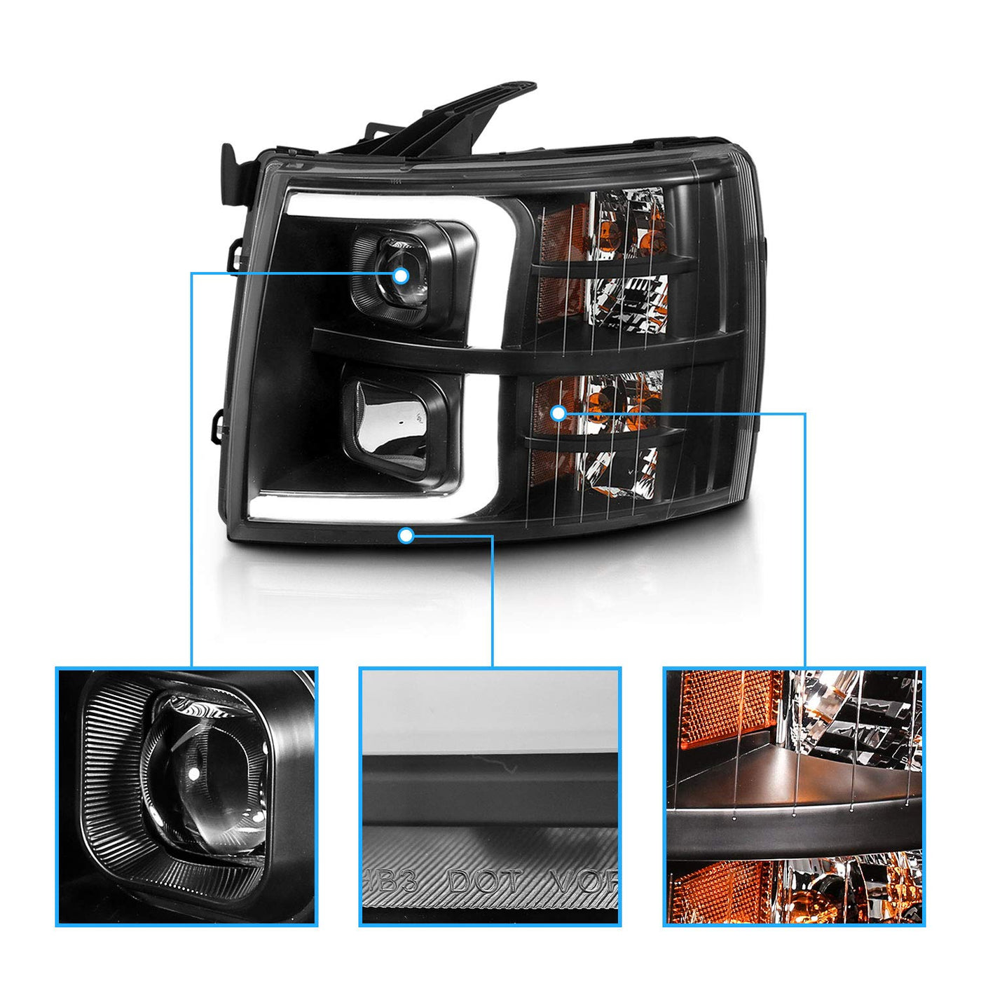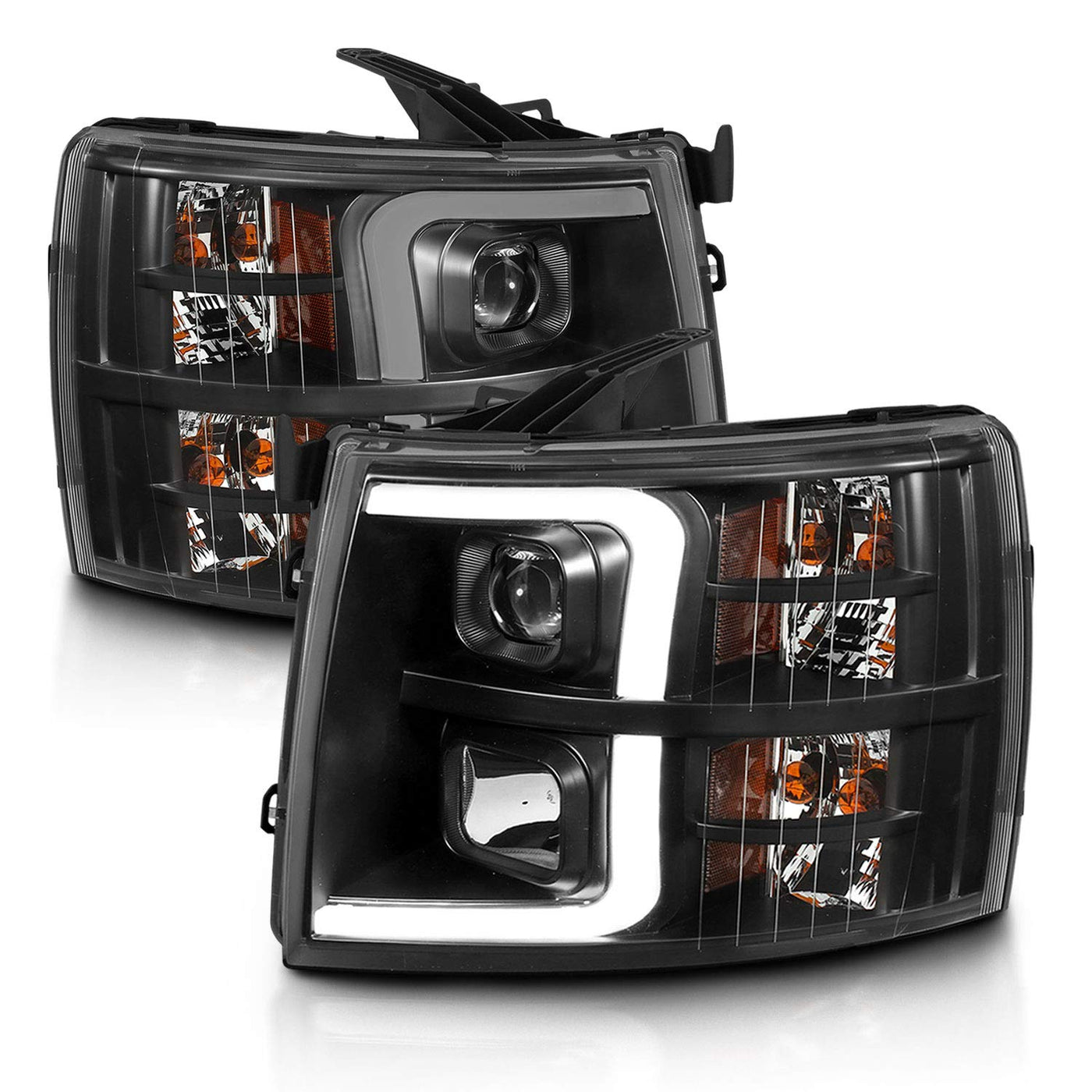 Amerilite For 2007-2013 Chevy Silverado 1500/07-14 2500Hd 3500Hd Led, Halogen, Tube Quad Projector Car Headlights Assembly Set -
