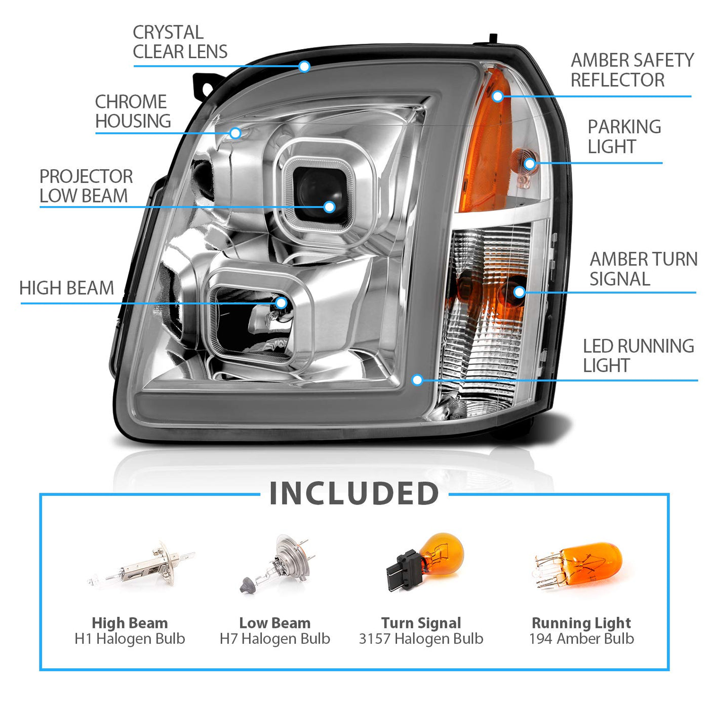 Amerilite For 2007-2014 Gmc Yukon/Yukon Xl Denali/Yukon Hybrid Chrome Led Tube Square Projector Headlights Set - Passenger And D