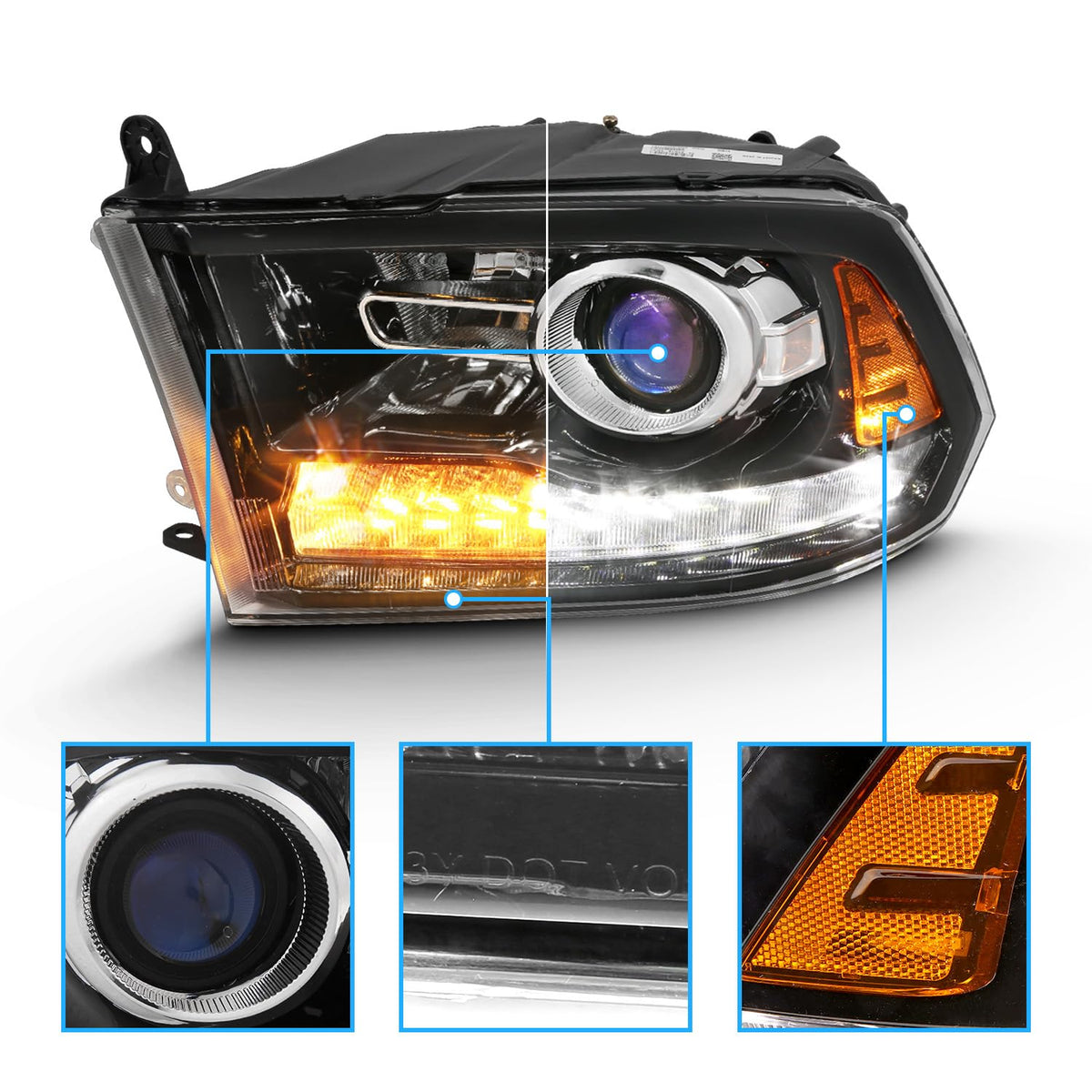Amerilite Halogen, Led, Projector Headlights For 2009-2018 Dodge Ram 1500 2500 3500 Assembly Tube Turn Signal Set, Vehicle Light Assembly, Polished Black With Switchback Led