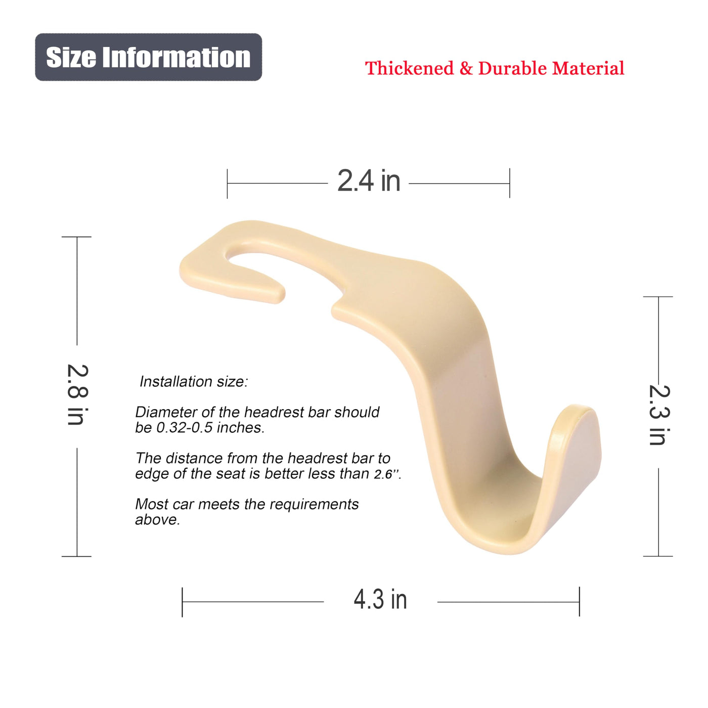 This Universal Car Seat Headrest Hook Is Specially Designed To Hang Groceries,Clothes,Umbrella,Handbags,Water Bottles,Baby Supplies And So On ,High-Quality Abs Material Made,Environmentaland Durble Product Specifications: High-Quality Abs Material Plastic This Hook Fits On The Seat Headrest Of Most Cars Upgraded Side Opening Design For Easy Installation,No Need To Remove The Headrest This Item Can Be Used For The Front Or Back Of The Seat Load Bearing:55 Lb(25Kg)Per Hook (Installation Size: 032-055 Inch Diameter Of The Headrest Bar) Package Included 4 X Car Font Back Seat Hook