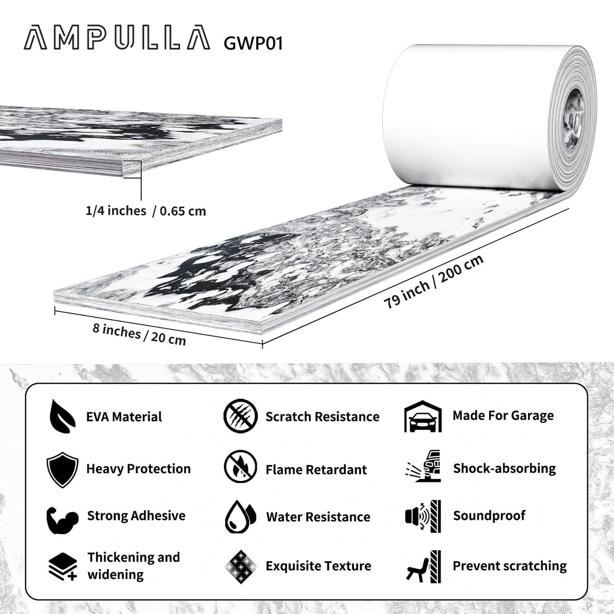 Ampulla Garage Wall Protector 's Features: - Fully protection for your car doors and garage walls - Waterproof Surface - High-End Environment Friendly Material (RoHS Authentication) - Germany Design - Cuttable Strips for any type of walls Package Included: 2 x Garage wall protector (79 ''x 8 ''x 1/4 '' / 1/6 '') (Two Rolls in One Pack) Notice before use: 1. Please do not put under extremely high temperatures or exposure to the sun for long. 2. Please clean the wall surface and remove the dust or other particles and keep them dry Before sticking the strips on the wall.