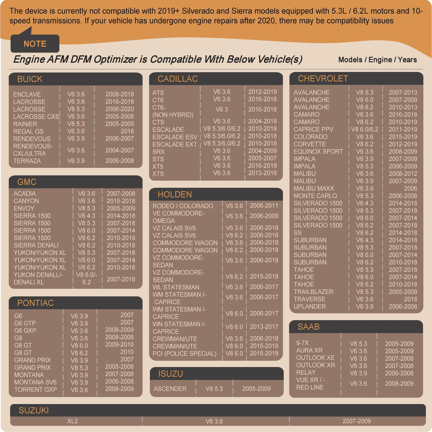Q: Is the AFM Disabler compatible with my GM vehicle?A: Yes, the AFM Disabler is compatible with GM vehicles from 2004 to 2019, including models such as Chevy Silverado, Tahoe, Suburban, and GMC Sierra, Yukon, and Denali. Ensure compatibility by checking your vehicle's engine size.