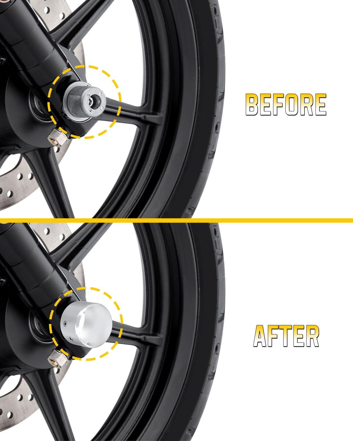 Q: How do these axle caps protect my motorcycle's front axle?A: The ANONEMOTO Front Axle Nut Covers are designed to protect your motorcycle's front axle shaft from dirt, moisture, dust, and potential damage. By covering the axle, they help maintain the integrity of the hardware, ensuring smoother operation and longevity of your bike.