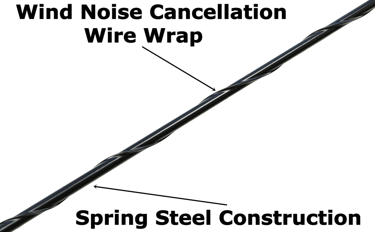 2) Wind Noise Cancellation Wrap. On our spring steel antennas we now offer with the feature that will get rid of the highway whistles aftermarket antennas are prone too. This noise without our noise cancellation feature is referred to as a noise of a freight train. This is a unique feature and should not be one overlooked.