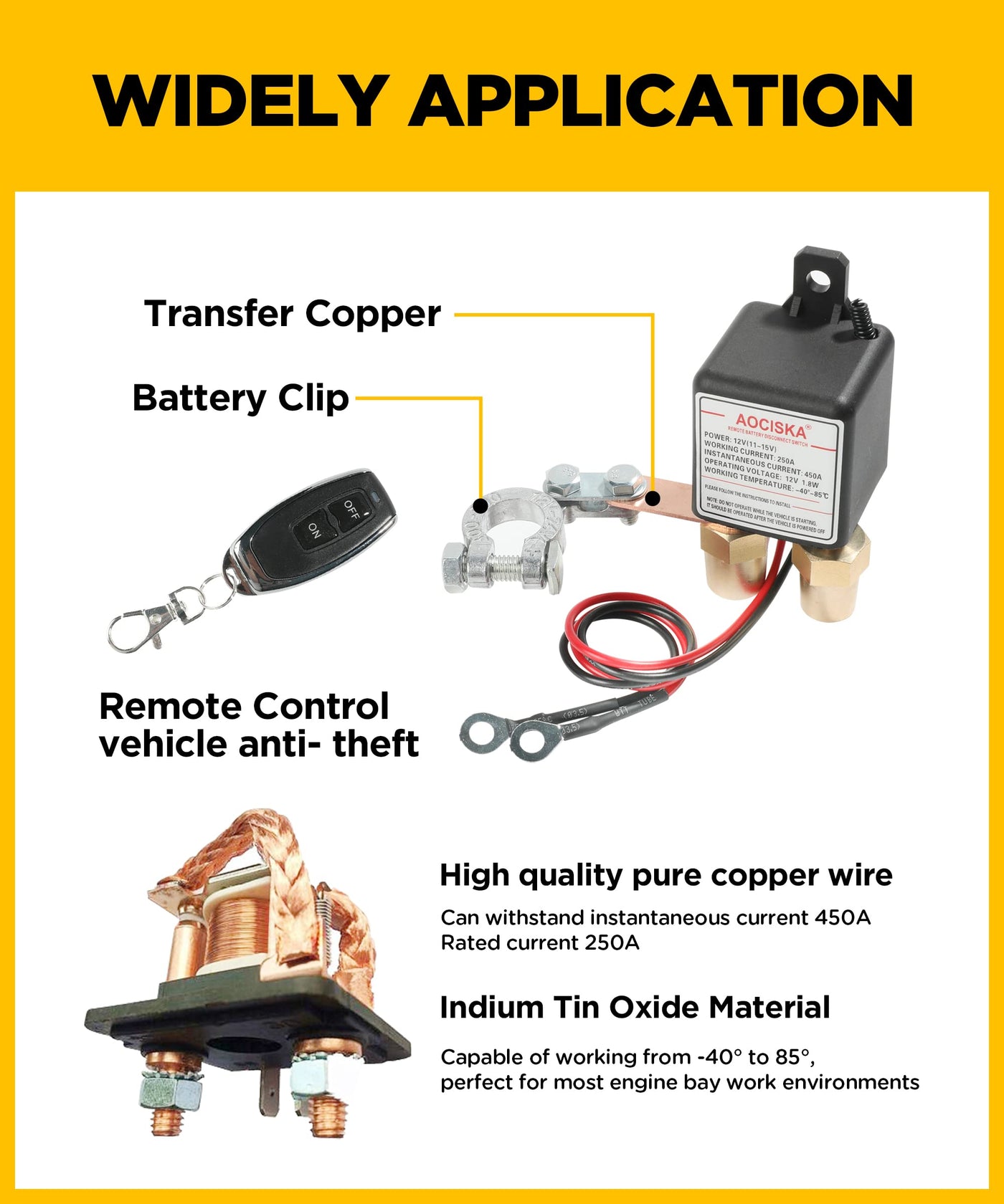 Q: Is this battery kill switch compatible with all 12V vehicles?A: Yes, the AOCISKA Remote Battery Disconnect Switch is compatible with a wide range of vehicles, including cars, trucks, RVs, and travel trailers that are equipped with a 12-volt battery.