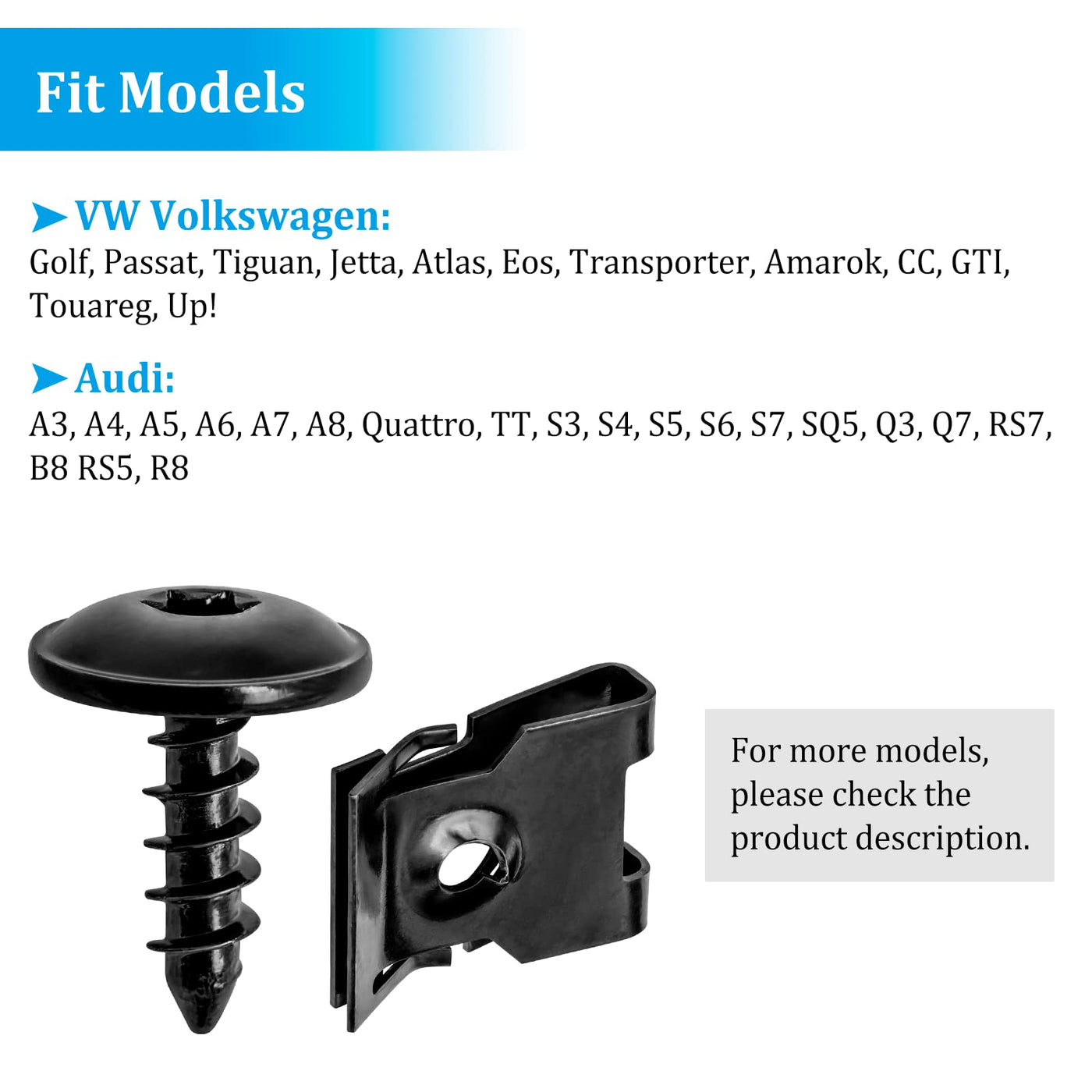Q: What vehicles are compatible with the AOIT 15pcs Screws Clips kit?A: The AOIT 15pcs Screws Clips kit is specifically designed to fit various VW Volkswagen models such as Golf, Passat, Tiguan, Jetta, Atlas, and Audi models including A3, A4, A5, A6, A7, A8, and more. Always check your vehicle's specifications to ensure compatibility.