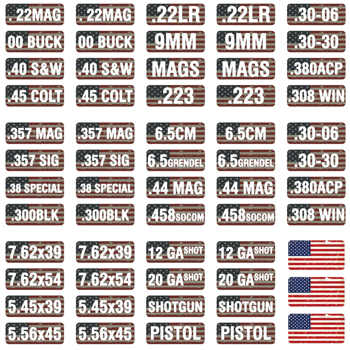 Aolamegs Ammo Can Vinyl Sticker Set Decal Label For Cans Cases Boxes .22 .223 .308 9Mm .380 .45 5.56 7.62 12Ga 300Blk (56 Pack/28 Varieties &3 Pcs Usa Flag Stickers)
