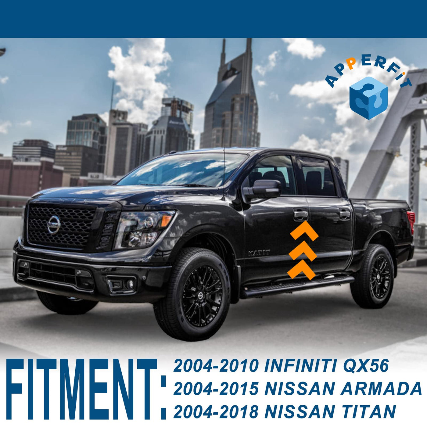 Q: What vehicles are compatible with the APPERFiT Door Handle Key Hole Bezel Cover?A: The APPERFiT Door Handle Key Hole Bezel Cover is compatible with the 2004-2010 Infiniti QX56, 2004-2015 Nissan Armada, and 2004-2023 Nissan Titan.