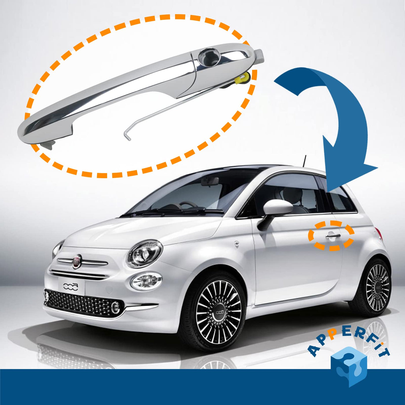 Q: What color is the APPERFiT Exterior Door Handle?A: The APPERFiT Exterior Door Handle features a sleek chrome finish, adding an elegant touch to your Fiat 500.