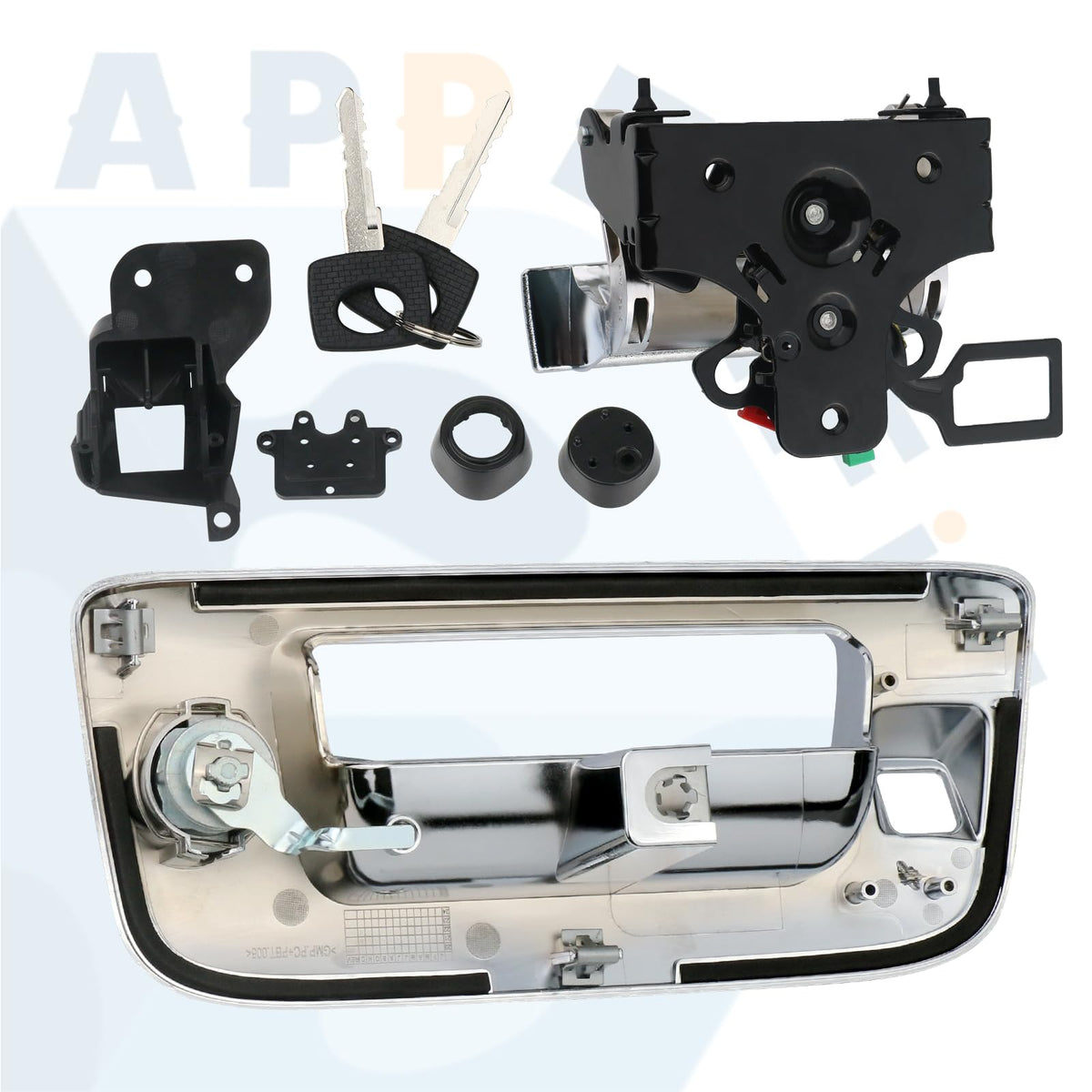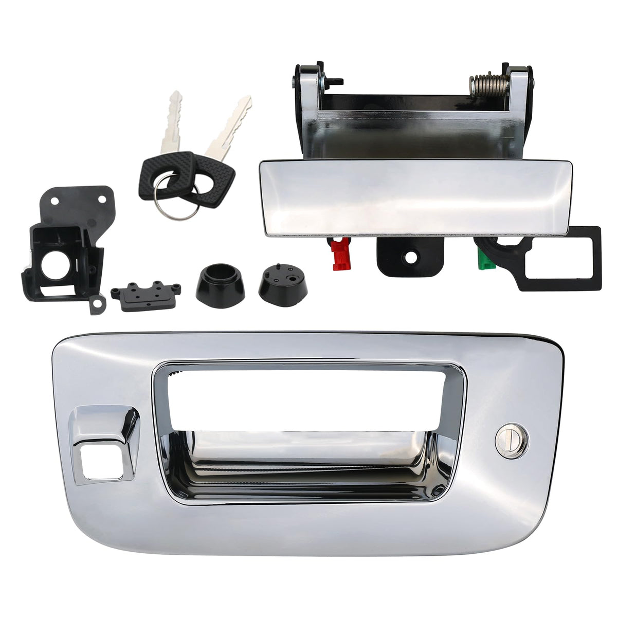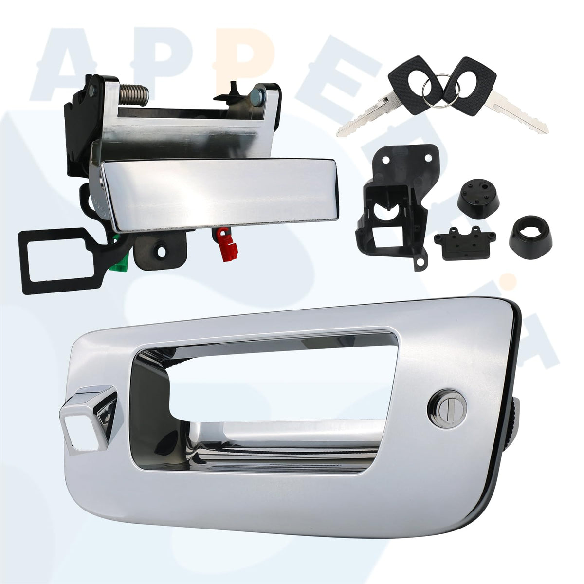 Part name: Locking Tailgate Handle Latch & Bezel with Lock Cylinder & Rear View Camera Hole Brand: APPERFiT Replacement part for OEM: 20928119 22755304 25775278 Placement on Vehicle: rear truck bed locking tailgate door panel Condition: NEW Color: Chrome Package includes: 1* Lockable Tailgate Handle Latch 1* Handle Bezel with Hole for Reverse Camera 1* Lock Cylinder 2* Keys Warranty: 1-year Fitment: 2007 Chevy Silverado 1500 New Body Style Tailgate Handle Latch & Bezel w/ Lock Cylinder, Keys & Hole for Backup Camera 2008-2013 Chevy Silverado 1500 Tailgate Handle Latch & Bezel w/ Lock Cylinder, Keys & Hole for Backup Camera 2007 Chevy Silverado 2500 HD New Body Style Tailgate Handle Latch & Bezel w/ Lock Cylinder, Keys & Hole for Backup Camera 2008-2014 Chevy Silverado 2500 HD Tailgate Handle Latch & Bezel w/ Lock Cylinder, Keys & Hole for Backup Camera 2007 Chevy Silverado 3500 HD New Body Style Tailgate Handle Latch & Bezel w/ Lock Cylinder, Keys & Hole for Backup Camera 2008-2014 Chevy Silverado 3500 HD Tailgate Handle Latch & Bezel w/ Lock Cylinder, Keys & Hole for Backup Camera 2007 GMC Sierra 1500 New Body Style Tailgate Handle Latch & Bezel w/ Lock Cylinder, Keys & Hole for Backup Camera 2008-2013 GMC Sierra 1500 Tailgate Handle Latch & Bezel w/ Lock Cylinder, Keys & Hole for Backup Camera 2007 GMC Sierra 2500 HD New Body Style Tailgate Handle Latch & Bezel w/ Lock Cylinder, Keys & Hole for Backup Camera 2008-2014 GMC Sierra 2500 HD Tailgate Handle Latch & Bezel w/ Lock Cylinder, Keys & Hole for Backup Camera 2007 GMC Sierra 3500 HD New Body Style Tailgate Handle Latch & Bezel w/ Lock Cylinder, Keys & Hole for Backup Camera 2008-2014 GMC Sierra 3500 HD Tailgate Handle Latch & Bezel w/ Lock Cylinder, Keys & Hole for Backup Camera