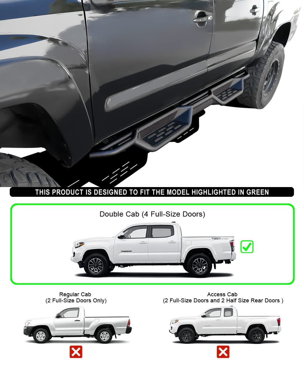FitmentCompatible with Toyota Tacoma 2005-2023 Double/Crew CabPackage ContentPair of Side Steps + Mounting Brackets Kit & InstructionDescriptionFull Set Includes: Pair of 2 running boards, support brackets, mounting Kit, hardware, and DIY instructions.