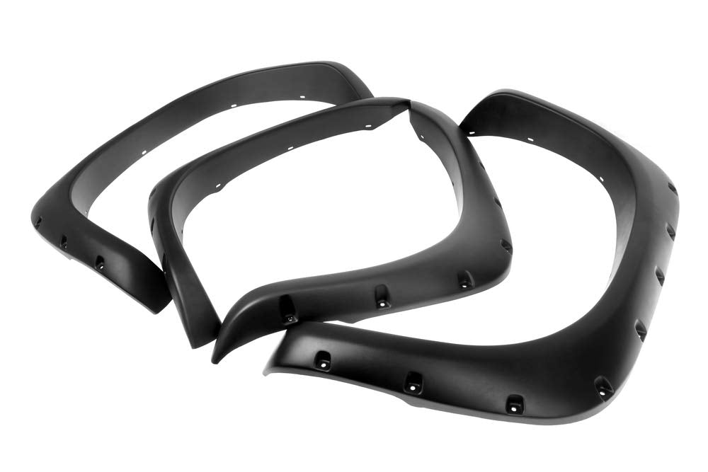 Q: How do these fender flares enhance the look of my truck?A: The APS Fender Flares provide a stylish upgrade to your truck's appearance, featuring a gloss black finish that enhances its overall aesthetic. They are designed to give your vehicle a rugged, off-road ready look while providing additional tire coverage.