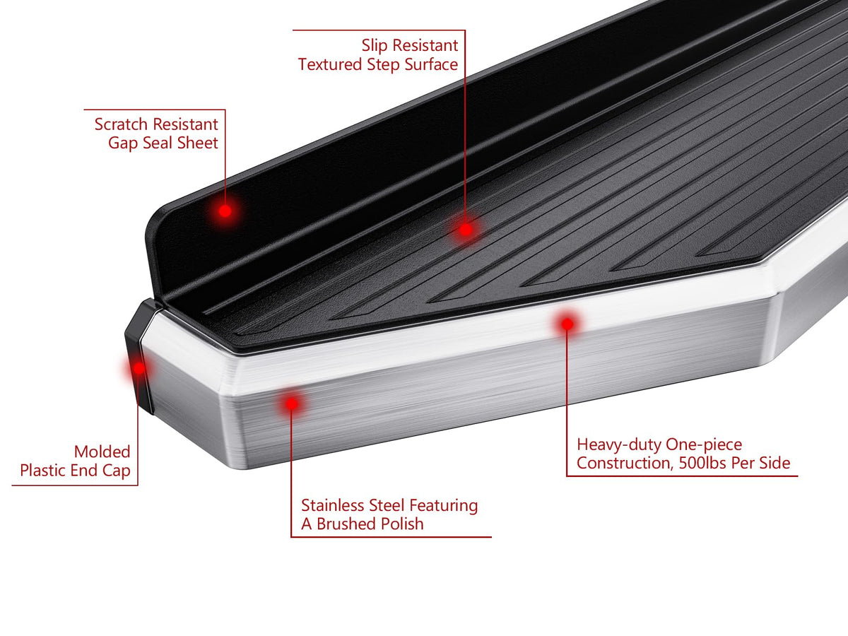 FitmentCompatible with Chevy Colorado 2015-2025 Extended Cab Compatible with GMC Canyon 2015-2025 Extended CabPackage ContentPair of Side Steps + Mounting Brackets Kit & InstructionDescriptionUpgrade your pickup truck with APS 6in Flat Style Running Boards, meticulously designe for Chevy Colorado GMC Canyon 2015-2025 Extended Cab. Crafted from Stainless Steel and finished with a brush polish,these boards not only resist rust but also provide a comfortable step-on experience. Their rubber backsplash and tapered ends enhance the vehicle's aesthetics, while the anti-slip tread pad ensures safety in every step. With easy installation and a tailored fit, these running boards seamlessly blend style and functionality, setting new standards in automotive accessories.