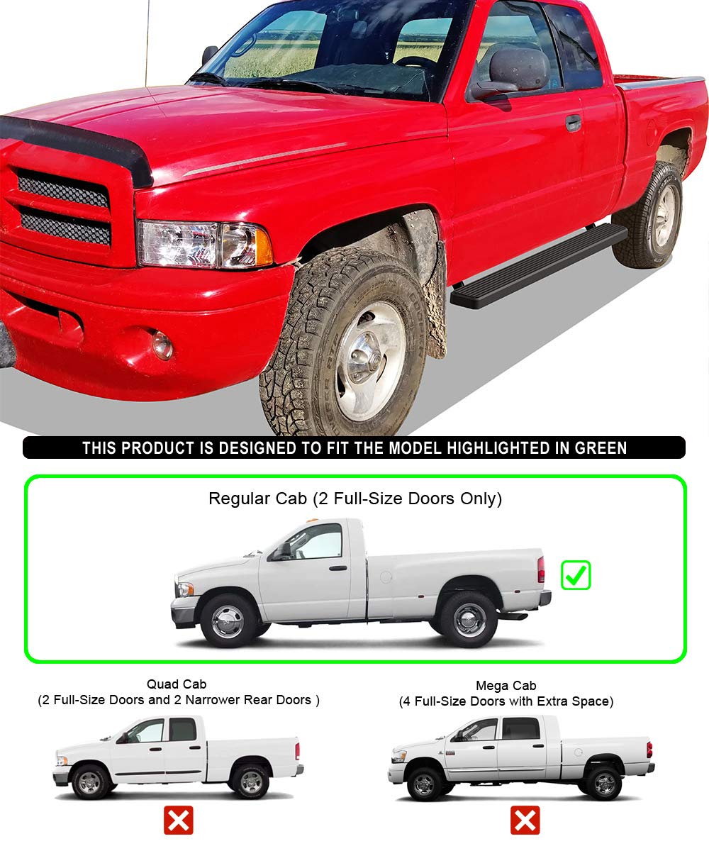 FitmentCompatible with Dodge Ram 1500 1994-2001 Extended Cab (Excl. 2002 Body Style Sold in 2001) Compatible with Dodge Ram 2500 1994-2002 Extended Cab Compatible with Dodge Ram 3500 1994-2002 Extended CabPackage ContentPair of iBoards + Mounting Brackets KitDescriptioniBoard, by APS is a new generation of running boards designed to look and feel different. Most running boards in the market are round or oval. iBoard's flat profile design is clean and modern - giving your truck a truly distinct look.