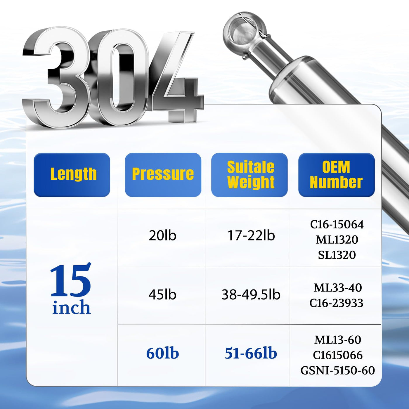 Arana 15 Inch 60Lb Stainless Steel Gas Struts Spring Prop, 2 Pcs Ml13-60 Gas Shock 15'' Lift Support Marine Gas Struts For Boat