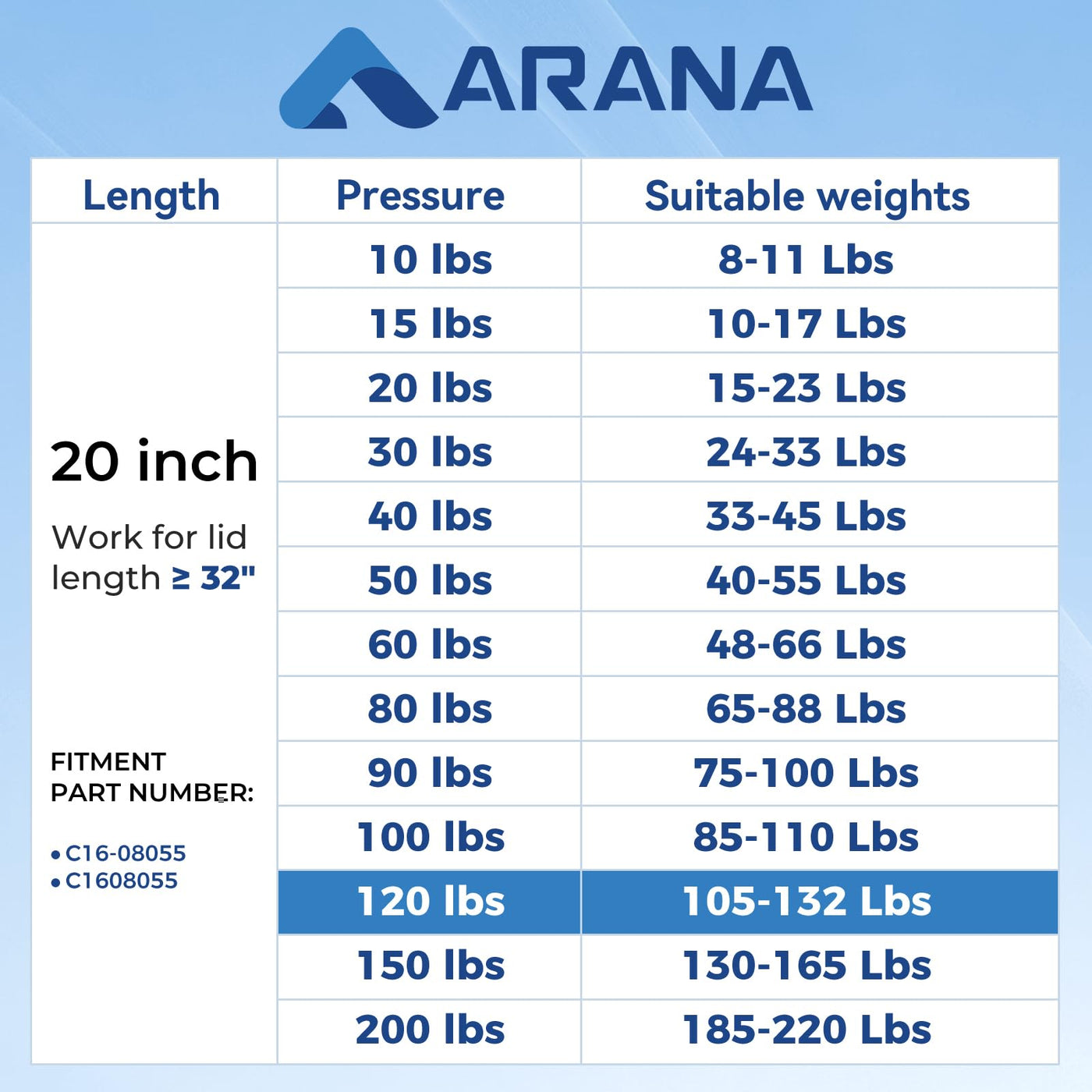 ARANA 20'' 120lb gas strut shocks are widely used on Direct replacement struts for heavy-duty ARE Leer truck pickup bed platform tonneau Cover, RV camper bed, travel trailer bed, murphy bed, heavy bar counter window shell, etc, as long as the lid weight is between 100-135 pounds; do measure the lid weight before purchasing, measuring method: use a pole and scale to weigh at the position where you will mount gas struts, usually at the position 20%-30% from the hinge.