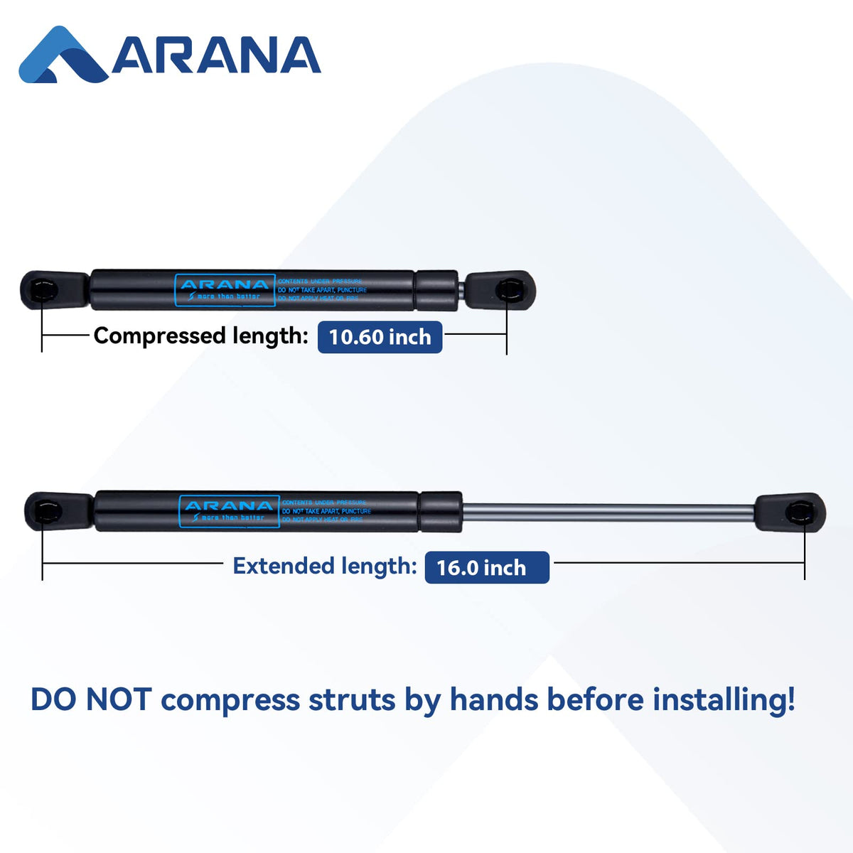 Q: Is there any special installation guidance for the ARANA gas struts?A: Yes, it's important not to compress the struts by hand before installation. Additionally, make sure the lid length is at least 16 inches and that the weight is approximately 40-60 pounds for optimal performance.