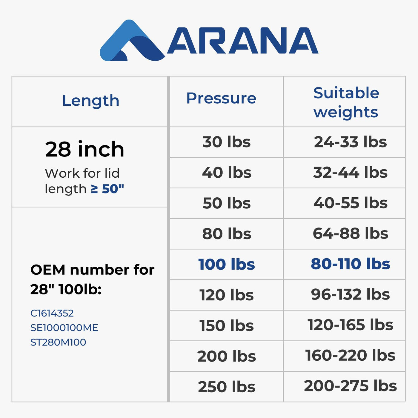 ARANA C16-14352 28in Lift Support 100 Pound Gas Shock Springs, SPD-3100-100 28'' 100Lb/445N Gas Struts Prop for Heavy Duty Lid Camper Bed Truck Bed Cover Trap Door Floor Hatch(Fit 80-110lbs Lid), 2Pcs