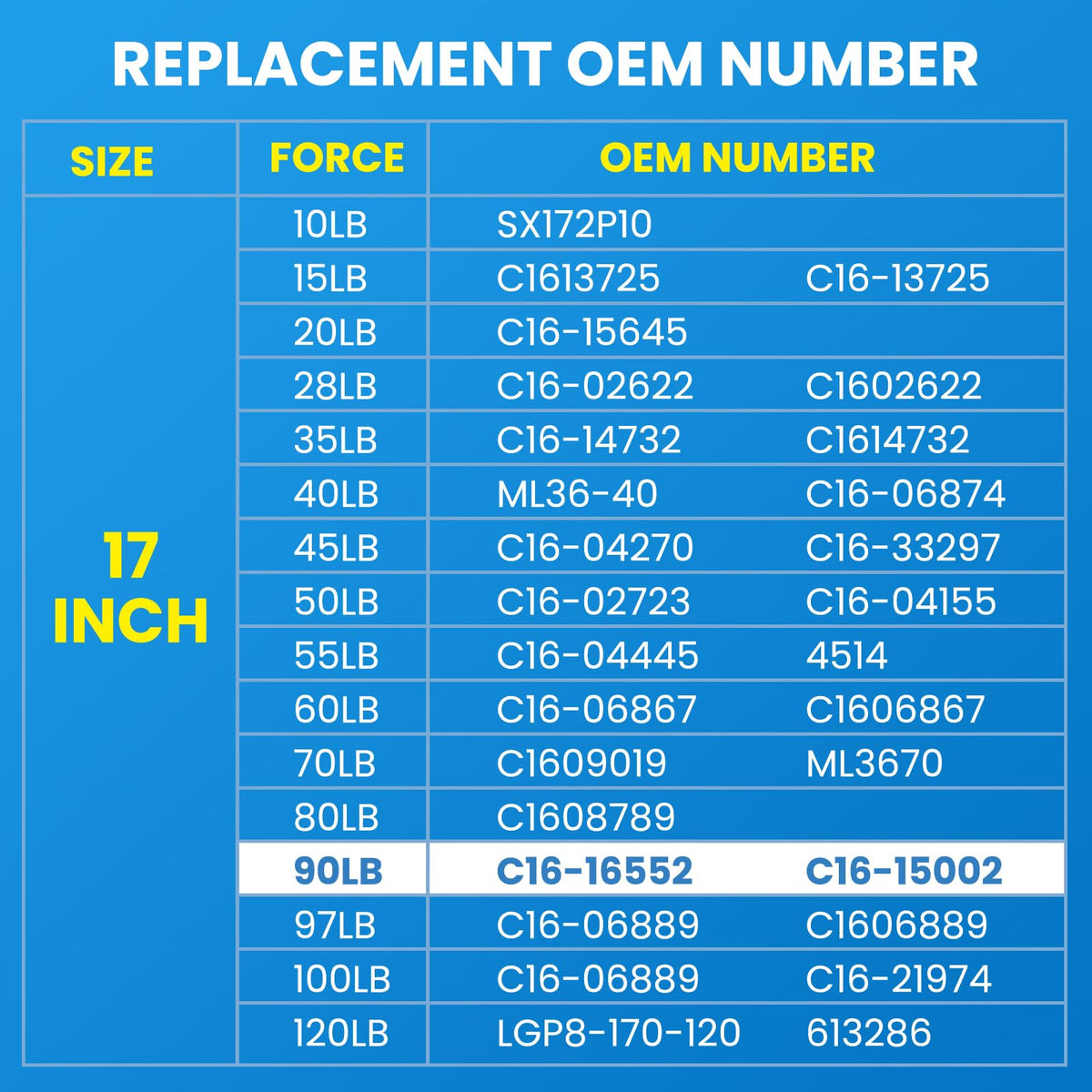 Interchange Part Number: 017079,1598EJ,1613EV,3002EE,3817LY,520090,86100,95811,C1615002,C1615072,C1616552,C1616720,CS172090,FLF11,FLF11F,FLN11G,GS520090,GS520090WINN,ML3690,SE170P90,SE170P90S10,SG520090,SL3690,SL36901,SL36905,SPDGS520090,SPDGS520090WINNThe struts can be used on the the replacement parts for camper shell, travel trailer bed, motorhome storage/basement doors, boat hatch, DIY Builds, but please confirm the Interchange Number of your old sturts if you use the struts as the replacement, and re-check the length before purchasing to avoid buy wrongly; If you want to install on DIY builds, do measure the lid weight before purchasing, measuring method: use a pole and scale to weigh at the position where you will mount gas struts, usually at the position 20%-30% from the hinge. The struts are very heavy and only can be used on the lid weigh 75-100 lbs.
