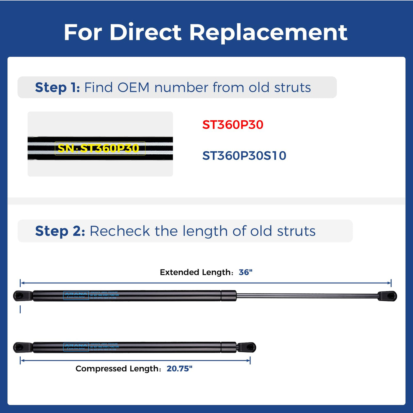 Q: How do I know if these gas struts are compatible with my application?A: To ensure compatibility, check the part number 'C16-22632' on your old strut's cylinder. Additionally, confirm that the size of your existing struts matches the 36-inch length of the ARANA struts. If using for DIY projects, the lid should be at least 60 inches long.