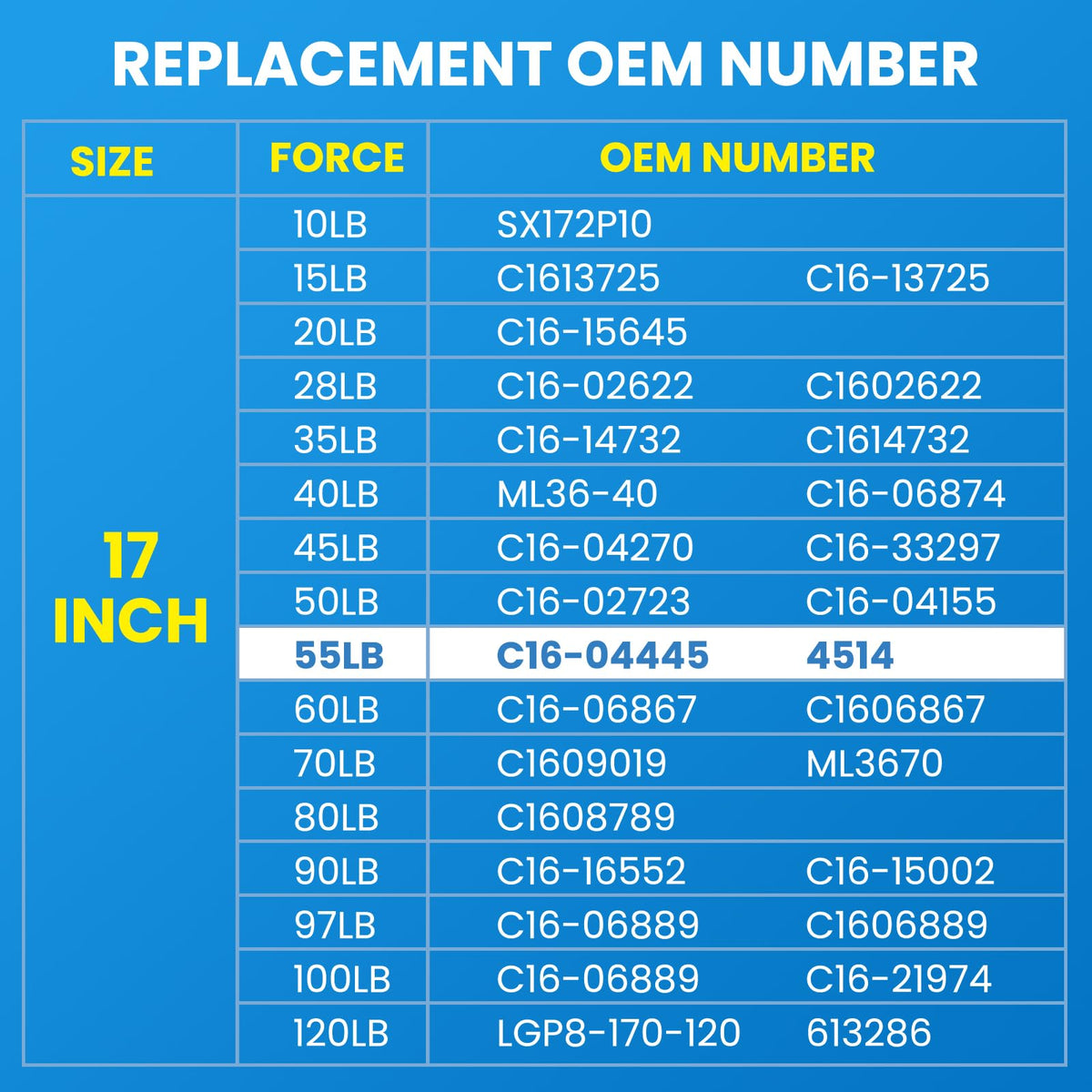 ARANA C16-04445 17 inch 55Lb Gas Struts Spring Shocks 4514 could be perfectly used as the replacement struts for Tool box Lid, truck topper sidde window, please check the part number on the strut cylinder and compare the size of your old struts to ensure you could buy correct replacement ARANA gas struts. Must-read IMPORTANT Parameters!Force/Pressure: 55lb (Per Strut);Package Content: 2 Gas Struts, 1 Installation ManualSize (Center-to-Center): Ext. Length: 17.2 '' (436.9 mm), Comp. Length: 10.6 '' (269mm)Intercharge part number: 1595EY, 4514, 8195565, AH8650, ML1650, ML16-50, ML-16-50, ML3650, ML36-50, ML-36-50, P2032, SE172P55,SE618A45PS130PM3, SE630V-55, SL1650, SL16-50, SL-1650, SL-16-50, SL16501, SL16-50-1, SL-16501,SL-16-50-1, SL16505, SL16-50-5, SL-16505, SL-16-50-5, SL3650, SL36-50, SL-3650; How to select correct ARANA gas struts?If use to replace old struts -Please check there 's above-mentioned part number on the cylinder body of your old strut, and ensure the size of your old struts as same as ARANA struts;If use on DIY builds -Please ensure the size length of the lid (installed with struts) is 26 inches at least for ARANA 17 inch shocks;Please weigh the lid at 20%~30% from the hinge of the door, if it reads about 44-61pounds, you could select the ARANA 1595EY 17 '' 55lb struts; NOTE: ARANA struts couldn 't be compressed until installing, please do not try to compress them by hands or body before installing!Every ARANA lift strut comes with 18+1 replacement and lifetime technical support, please ask for in-time assistance!