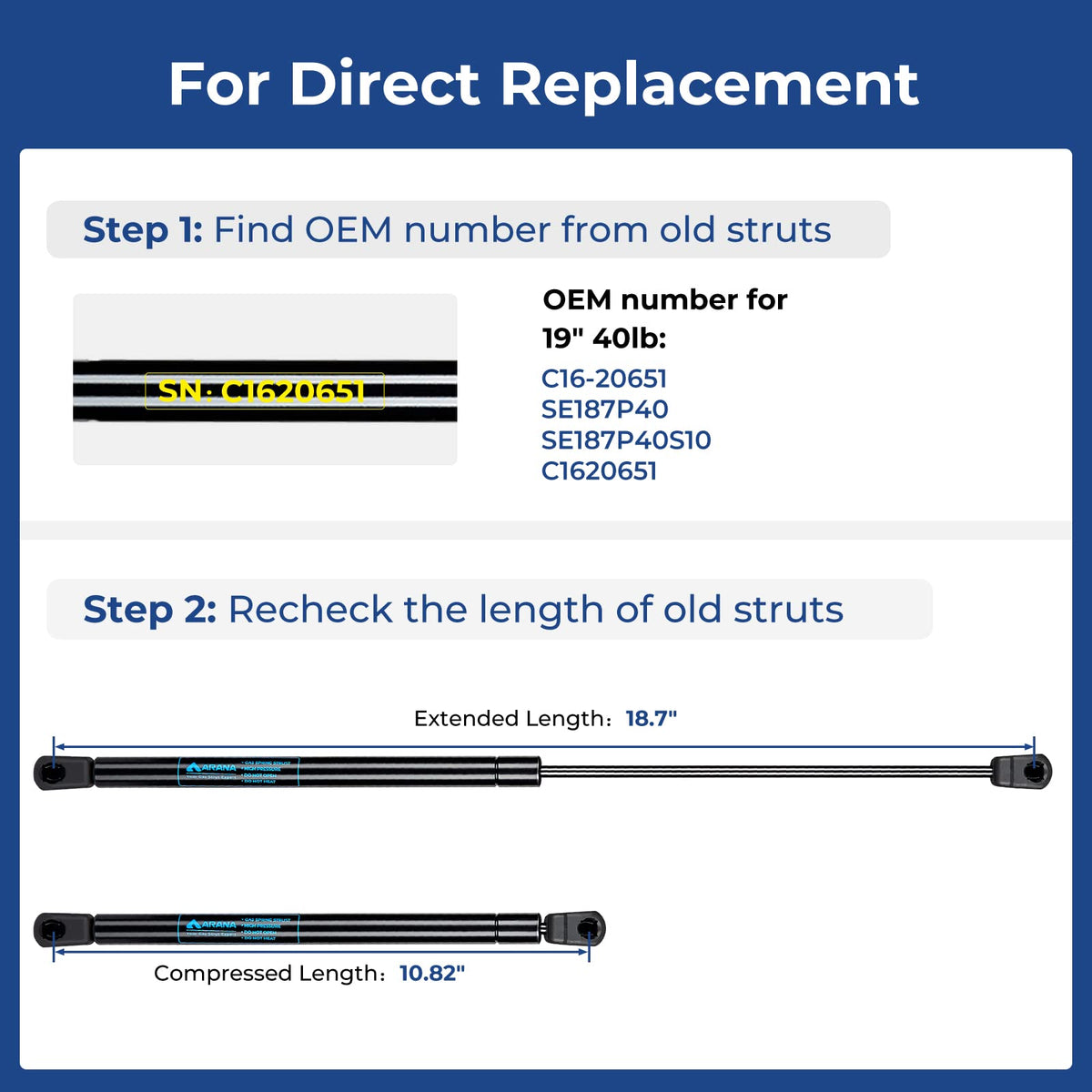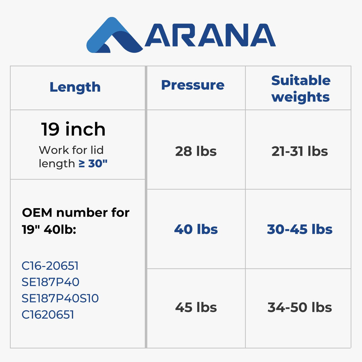 ARANA Qty(2) C1620651 18.7" Force 40 Lbs Gas Spring Shocks Prop Struts 19inch 40lbs for Camper Window Shell Truck Topper A.R.E. Leer Shell Pickup Canopy Lid C16-20651 (Ext. length 18.70 inch)