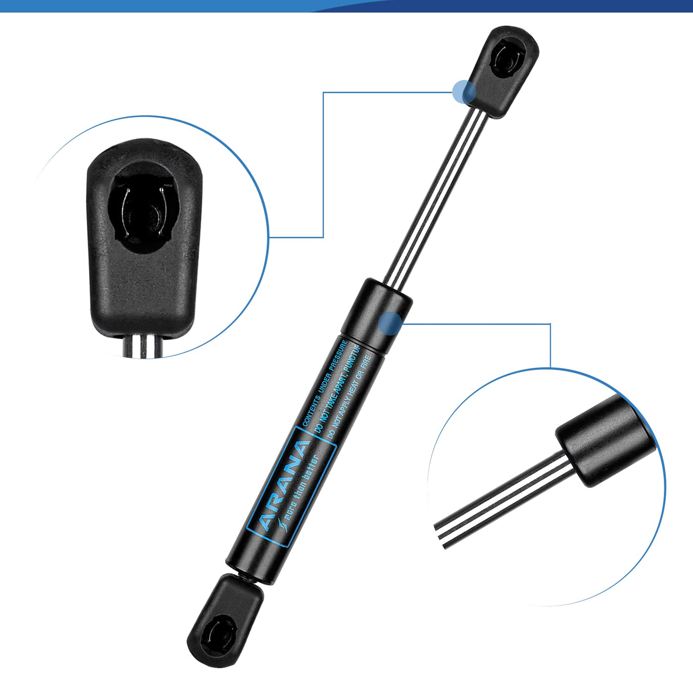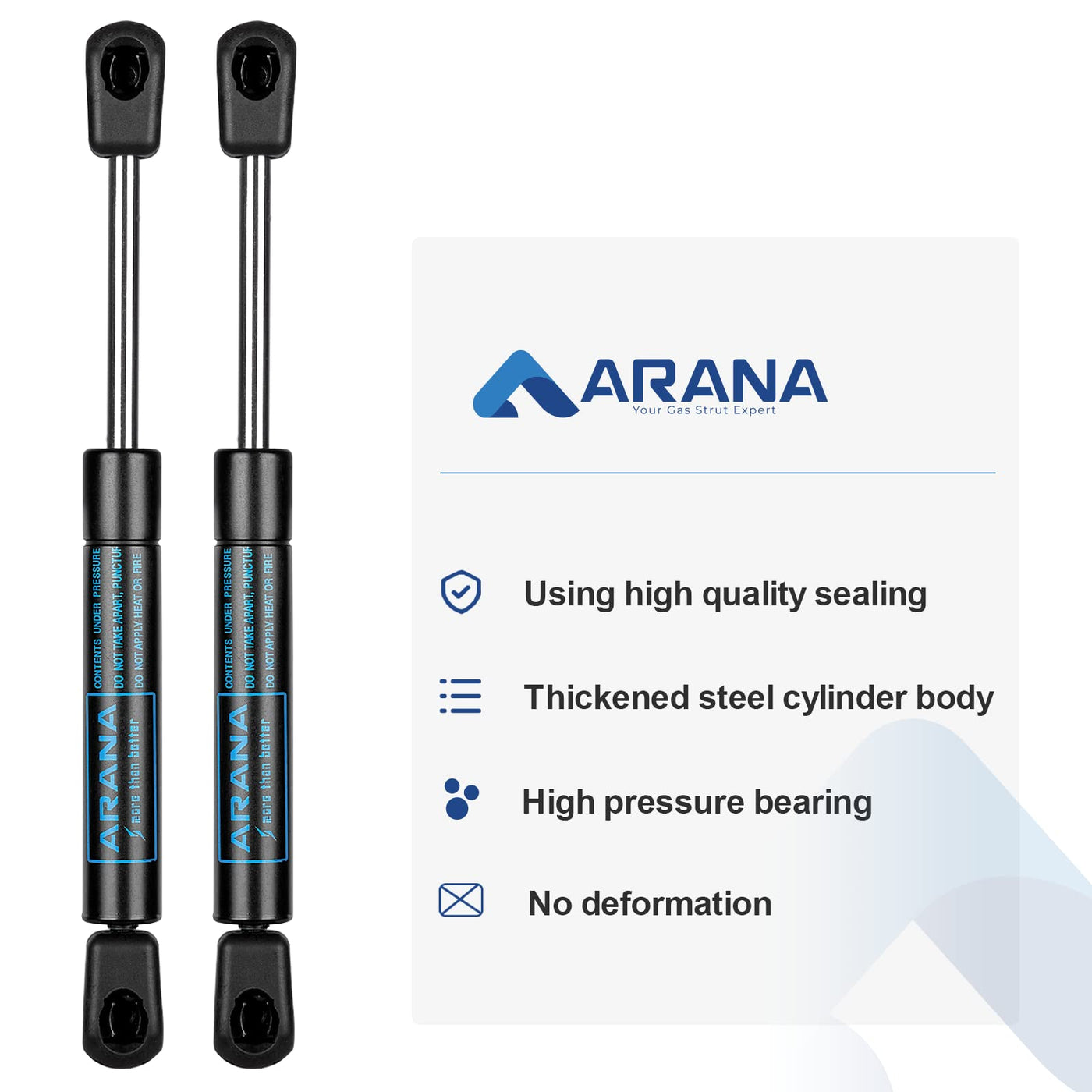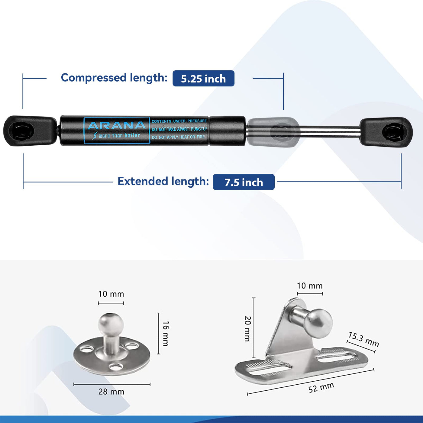 Q: What are the dimensions of the ARANA gas struts?A: The extended length of the ARANA gas struts is 7.50 inches, while the compressed length is 5.35 inches, making them ideal for various applications where space is a consideration.