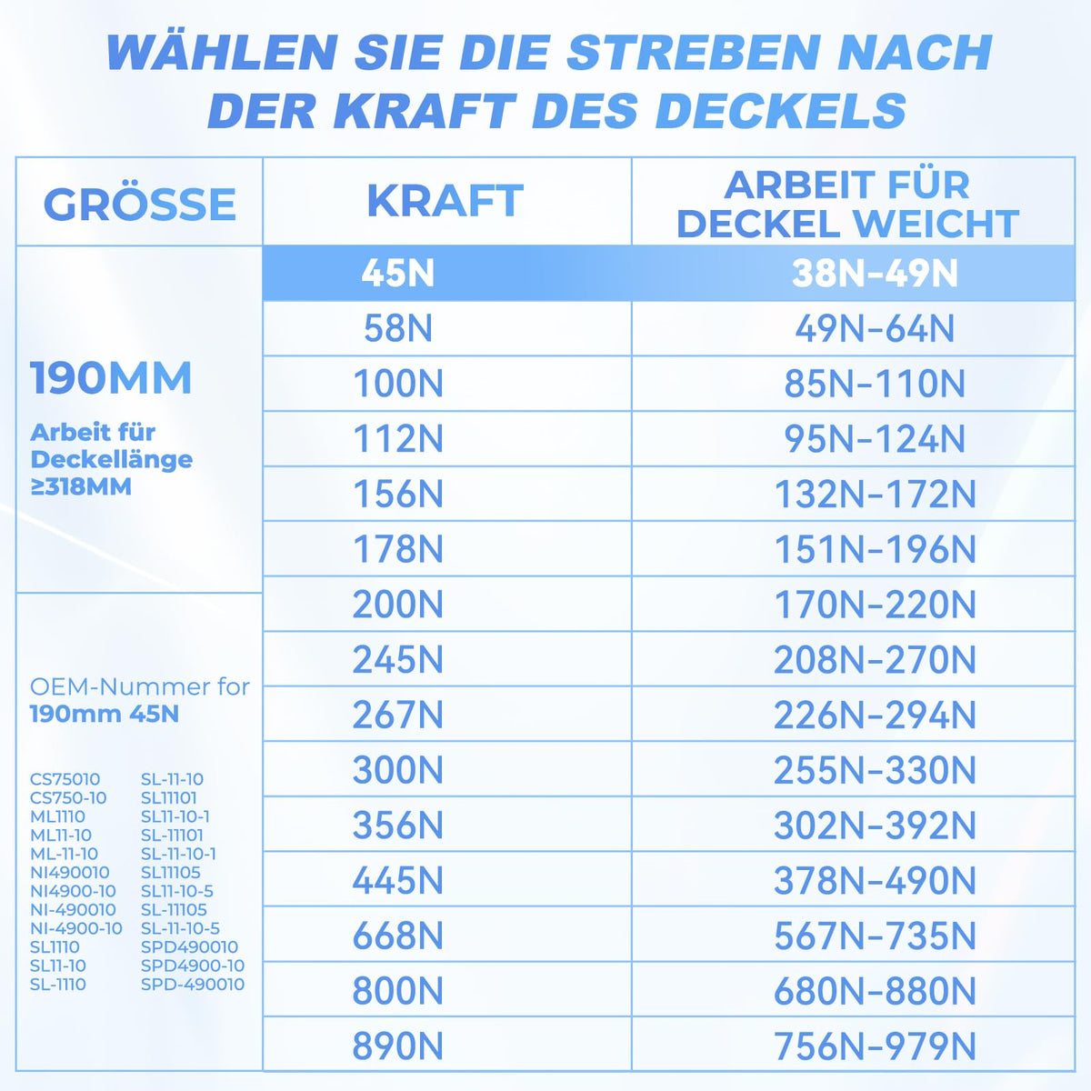 Q: What is the weight capacity of the ARANA SPD490010 gas struts?A: The ARANA SPD490010 gas struts are designed to support a weight of 10 lbs each, making a total of 20 lbs for the pair. They are most suitable for lids weighing between 8 to 11 lbs.