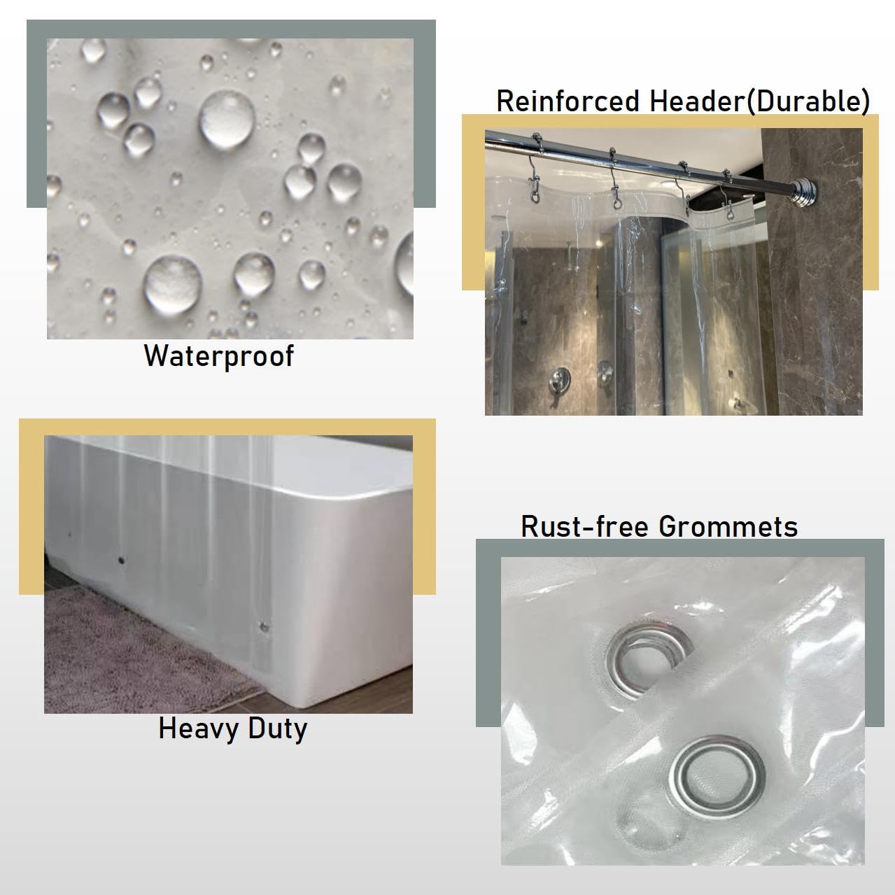 Q: Is the material of the shower curtain liner safe for my bathroom?A: Yes, the shower curtain liner is made from premium PEVA, which is non-toxic, PVC-free, chlorine-free, and odorless, ensuring a safe and healthy environment for your bathroom.