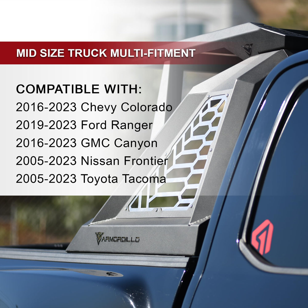 Q: What pickup truck models are compatible with the ARMORDILLO CRX Roll Bar Chase Rack?A: The ARMORDILLO CRX Roll Bar Chase Rack is compatible with most mid-size pickup trucks, including the 2005-2024 Toyota Tacoma, 2005-2024 Nissan Frontier, 2015-2024 Chevrolet Colorado, 2015-2024 GMC Canyon, and 2019-2023 Ford Ranger models.