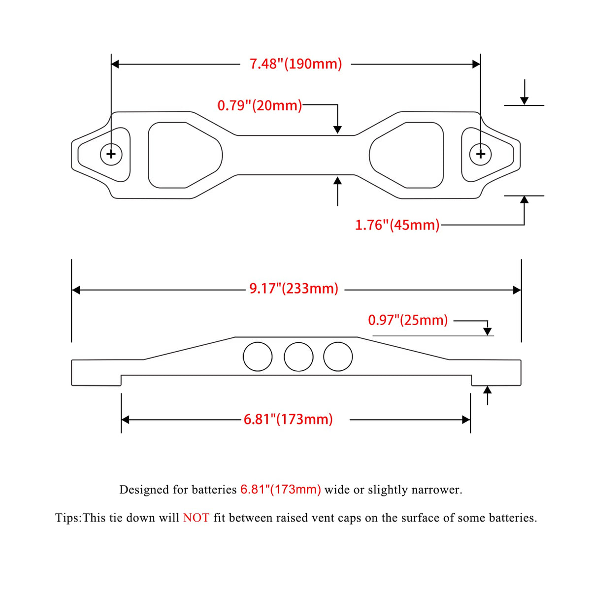 Q: What is the overall length of the battery tie down bracket?A: The overall length of the ARONOVA battery tie down bracket is 9.17 inches (233mm), with a bolt hole center-to-center measurement of 7.48 inches (190mm), making it suitable for batteries up to 6.81 inches (173mm) wide.