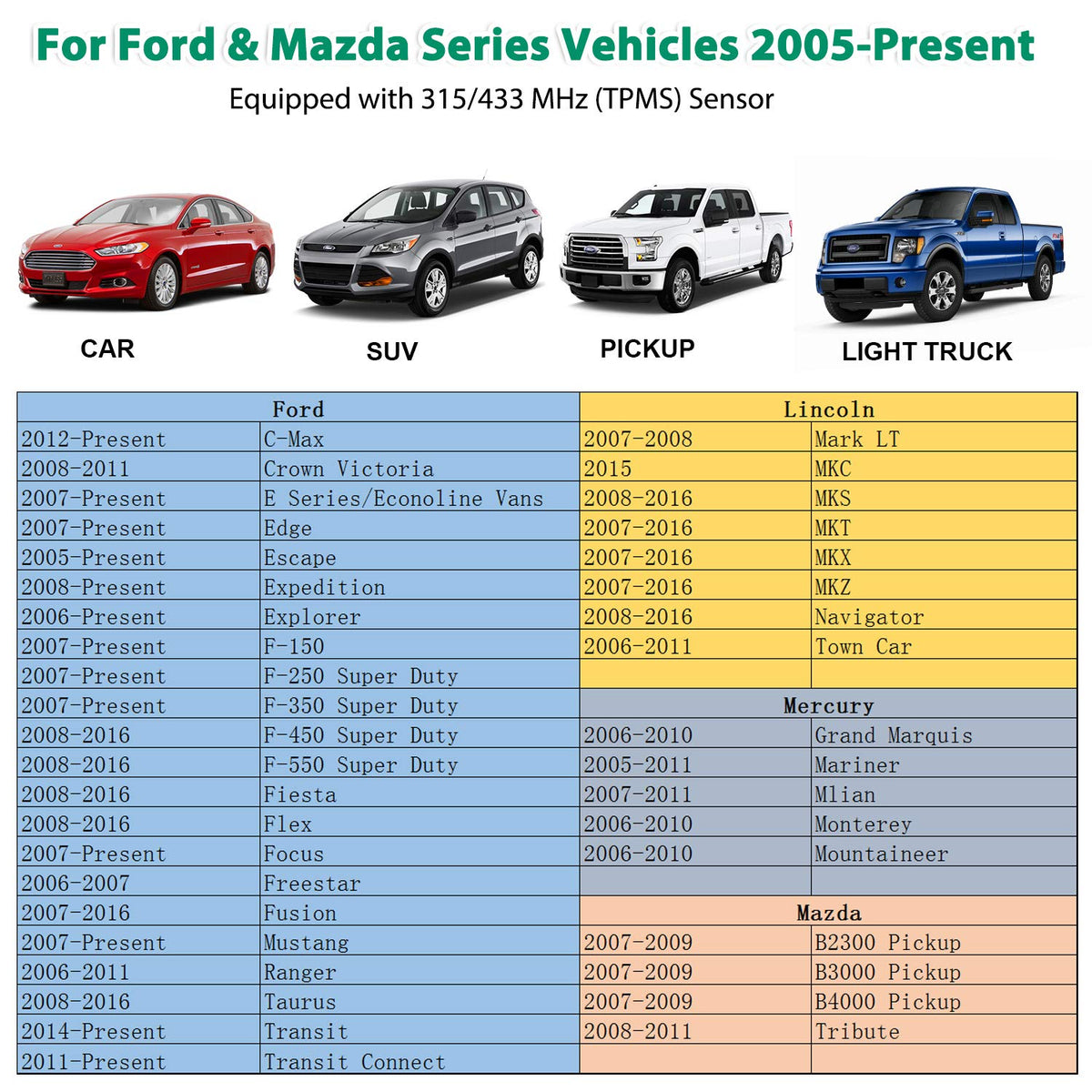 Q: What vehicles are compatible with the Arozk TPMS19 TPMS Reset Tool?A: The Arozk TPMS19 TPMS Reset Tool is customized for Ford and Mazda series vehicles from 2005 to present that are equipped with 315/433 MHz TPMS sensors.