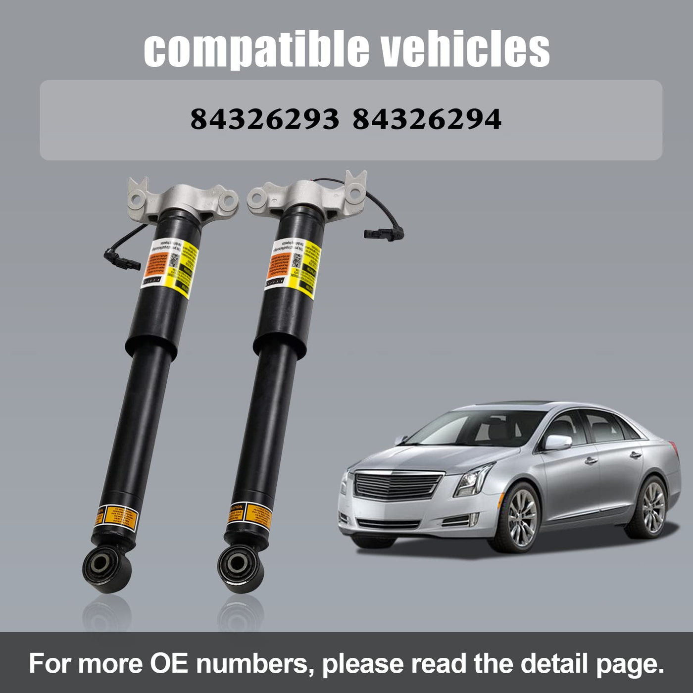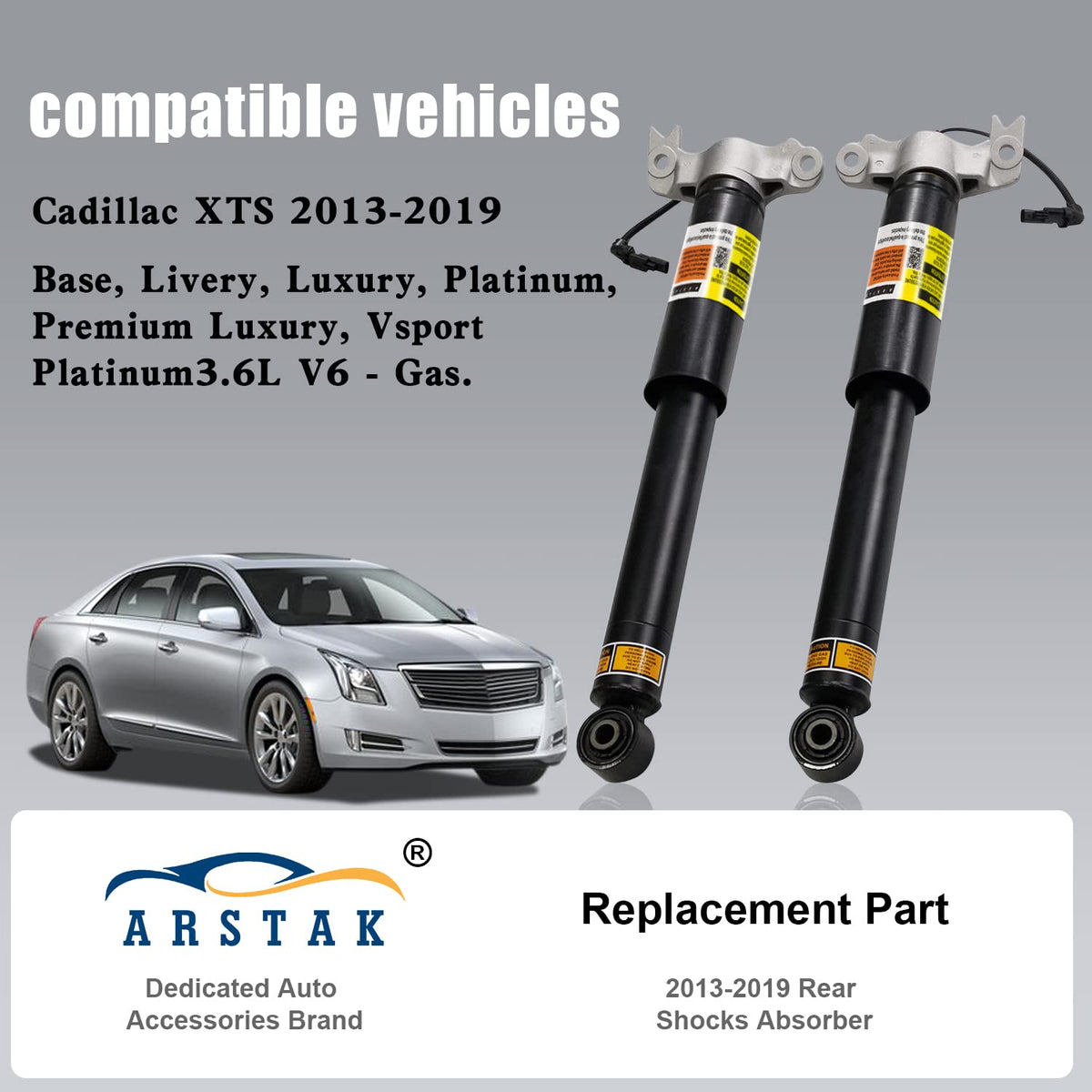 [XTS Rear Shock Strut Absorber] This rear shocks with Upper Mount Electric. Not sure if it's compatible with your vehicle? Pls tell us your VIN number. We can help you query as soon as possible. 7/24 Quick response. | [Replacement OE Part Number] ''Rear Driver Side'' 84326293, 19302782, 20903682, 22961781, 23457034, 23121780, 84326295, 23457036, 5801053, 5801074, 580409, 580426, SK3433; ''Rear Passenger Side'' 84326294, 19302783, 20903683, 22961782, 23457035, 23121781, 84326296, 84235851, 5801054, 5801075, 580410, 580427, SK3357; | [Suitable Models for XTS] Compatible for Cadillac XTS 2013 2014 2015 2016 2017 2018 2019 Base, Livery, Luxury, Platinum, Premium Luxury, Vsport Platinum 3.6L V6 - Gas w/ MagneRide. | [Designed for Cadillac XTS Component Standard] Standard interface, fit your X-T-S vehicle, providing the same performance, durability and service life. | [High-standard Oil Seal Technology] ARSTAK Shocks Fit your Car, providing same durability and service life. Note: ''1 Year W-arranty. Please feel free contact us 7/24 customers service.''